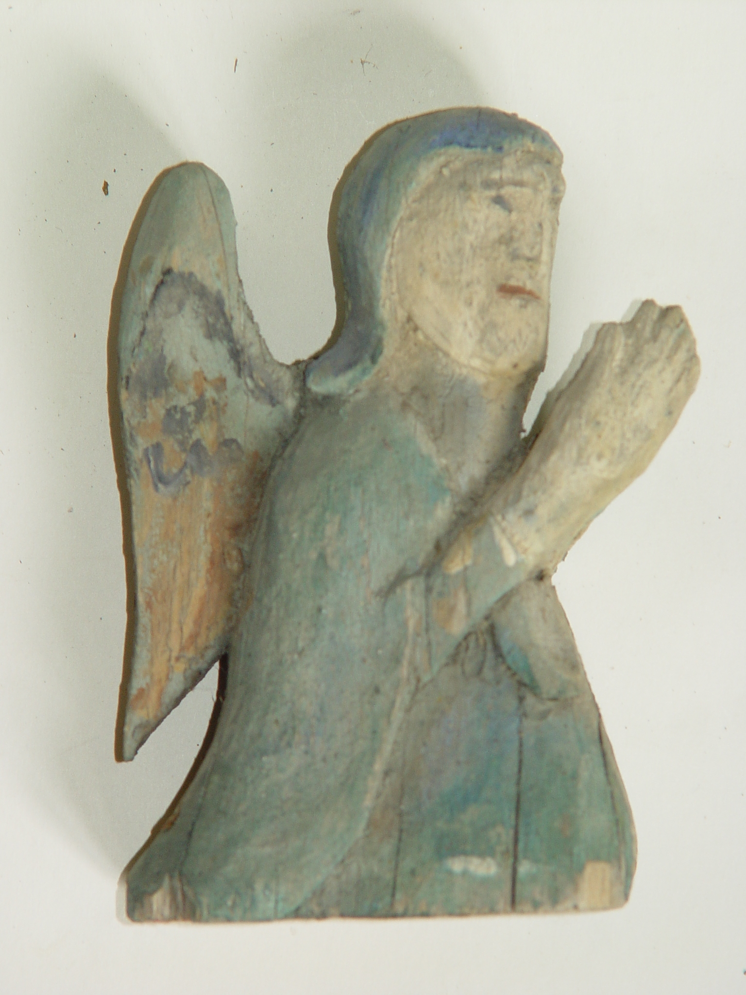 Înger sculptat în lemn, pictat. Văzut în profil, capul uşor întors spre spectator. Mînile împreunate în rugăciune. Gama cromatică: albastru, roşu, verde, bej.