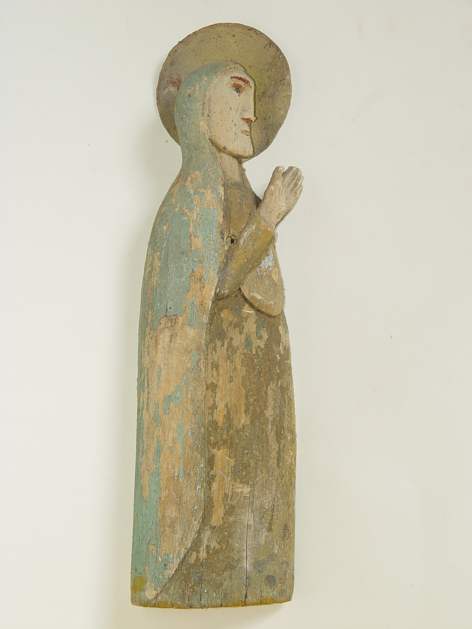 Sculptură în lemn, pictată. În profil spre drp: Fecioara Maria în plină statură. Capul acoperit. Ţine mînile împreunate în rugăciune. Gama cromatică: albastru, vierzui, brun, bej, roşu. Nimbul din carton, pe nimb - inscripţii.