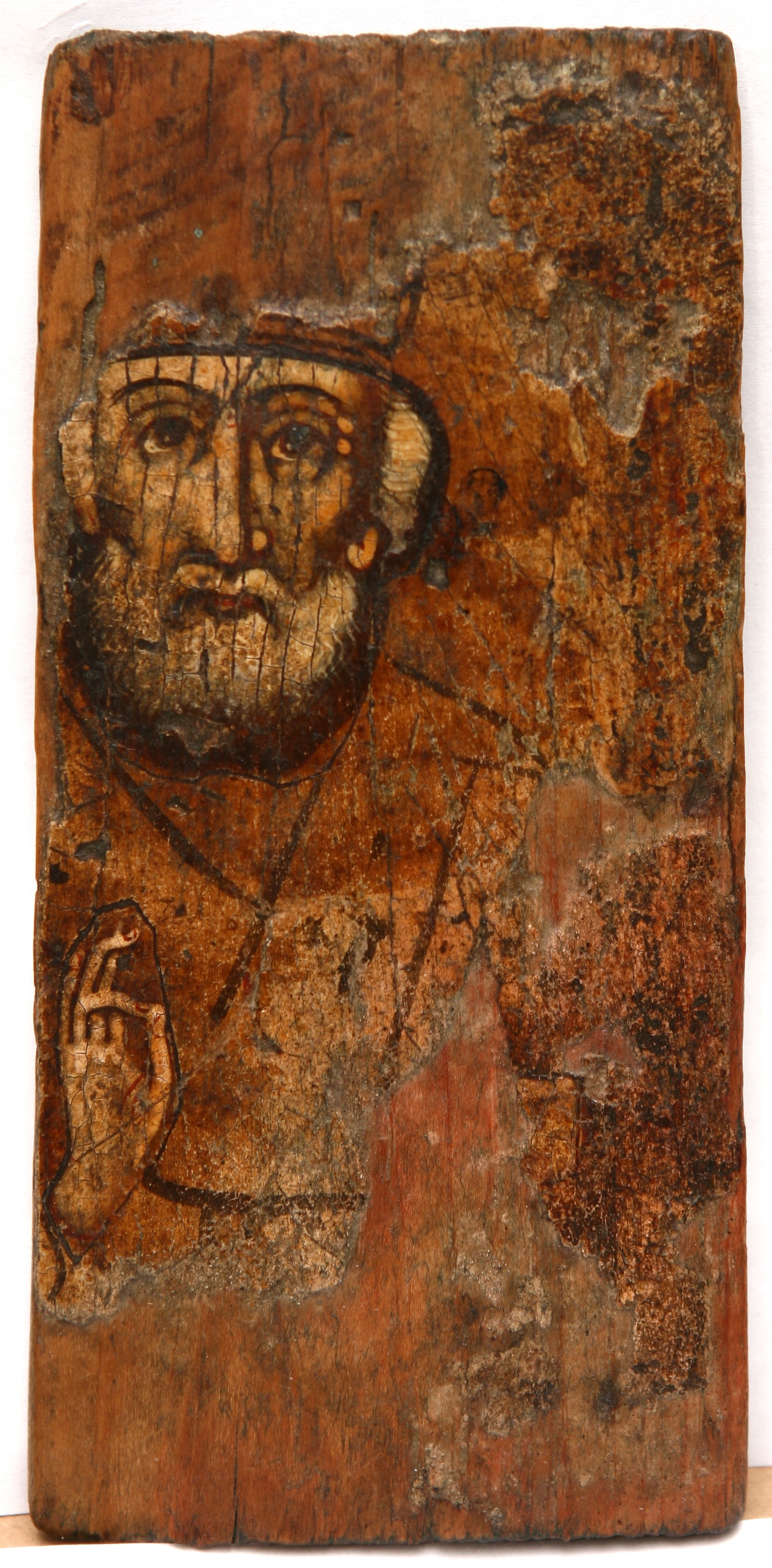 Fragment de icoană cu chipul Sfîntului Ierarh Nicolae redat fragmentar, bust. Cu mîna drp binecuvîntează. Gama cromatică: ocru, brun, gri. Verso: "s. Rotunda. 1969"