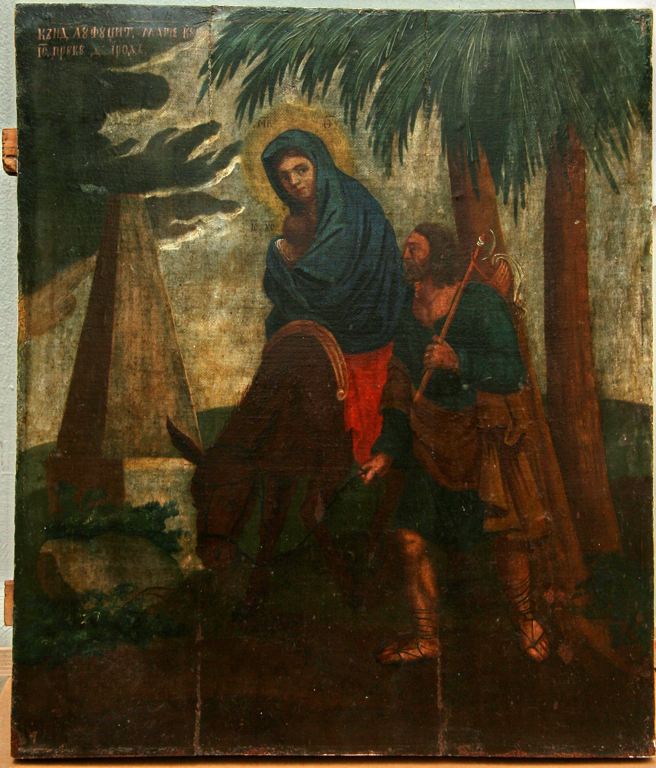 Pe fondal de peisaj: Iosif (plină statură) în tunică verde şi mantie brună, Fecioara Maria (alături) - călare pe măgar cu Iisus în braţe, poartă omofor albastru. Gama: brun, ocru, verde, roşu, albastru. Cer crepuscular.