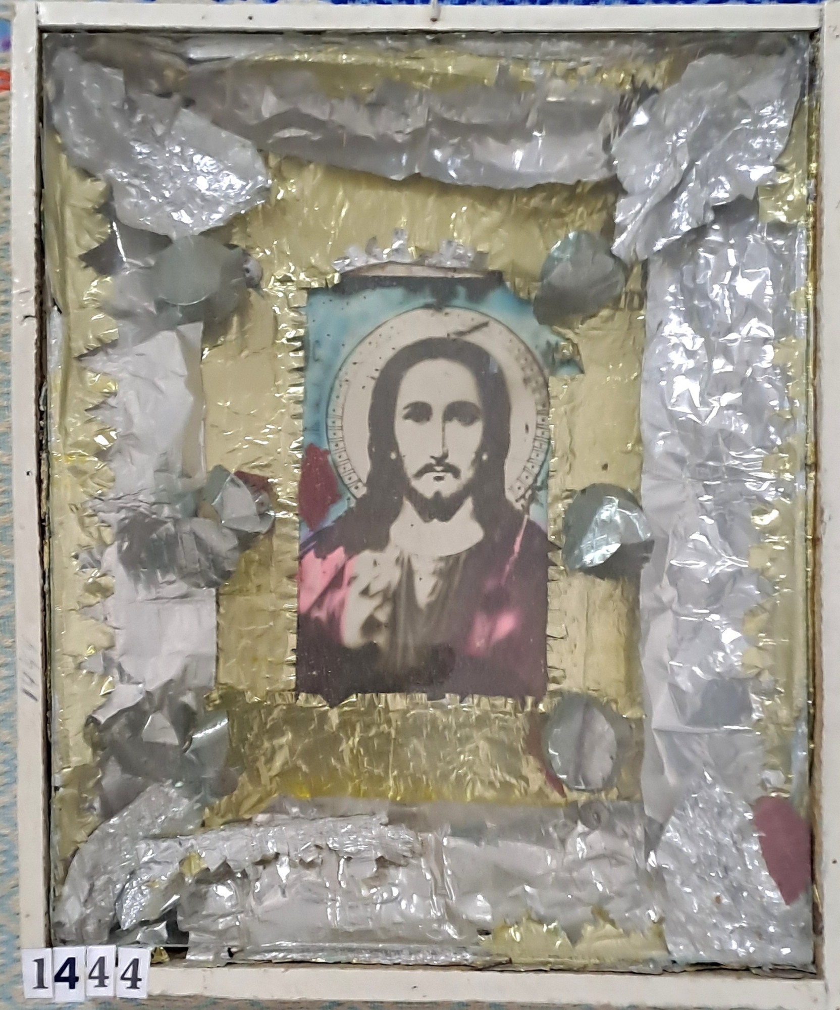 Icoană ,, ISUS HRISTOS '' , considerat protector al familiilor. Sfântul este înveșmântat cu o tunică de culoare închisă, având o mantie roză, cu mâna dreaptă binecuvântează. Icoana este realizată manual . Fotografia este amplasată într-o ramă pe lemn de culoare albă , cu steclă . Bordura interioară este bogat decorată cu hârtie metalică de culoare aurie, argintie. În colțuri este amplasată cîte o frunză de culoare argintie. În jurul fotografiei sânt așezate flori confecționate din hârtie metalică de culoare albă. Lemnul de la ramă este deteriorat.