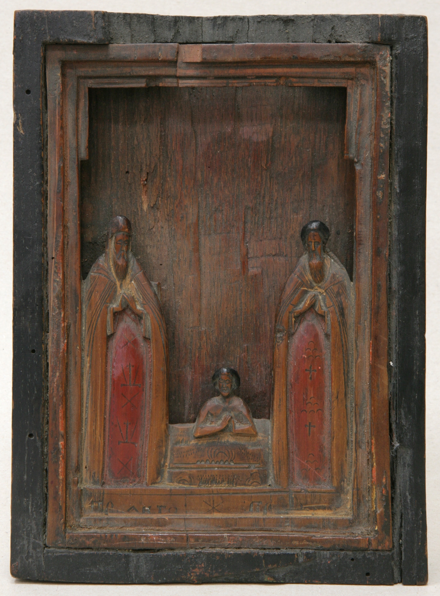 lucrată în lemn, redă 3 sfinţi decupaţi de cadru, cu diferenţe de niveluri; prinsă în ramă, margine jos - inscripţii.