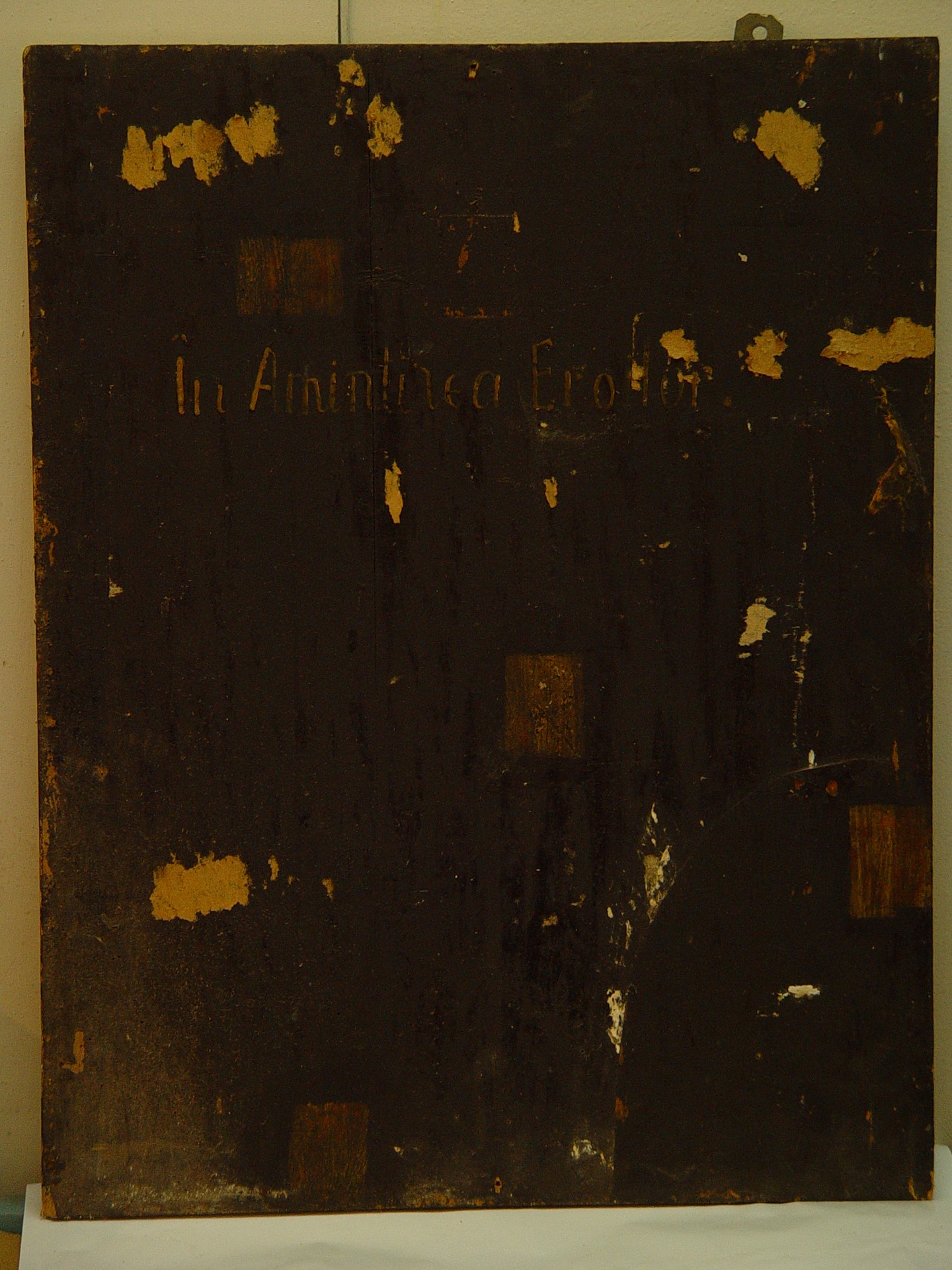 Pe fondal de culoare neagră, sus pe centru, o inscripţie în limba română, de culoare ocru: ÎN AMINTIREA EROILOR.