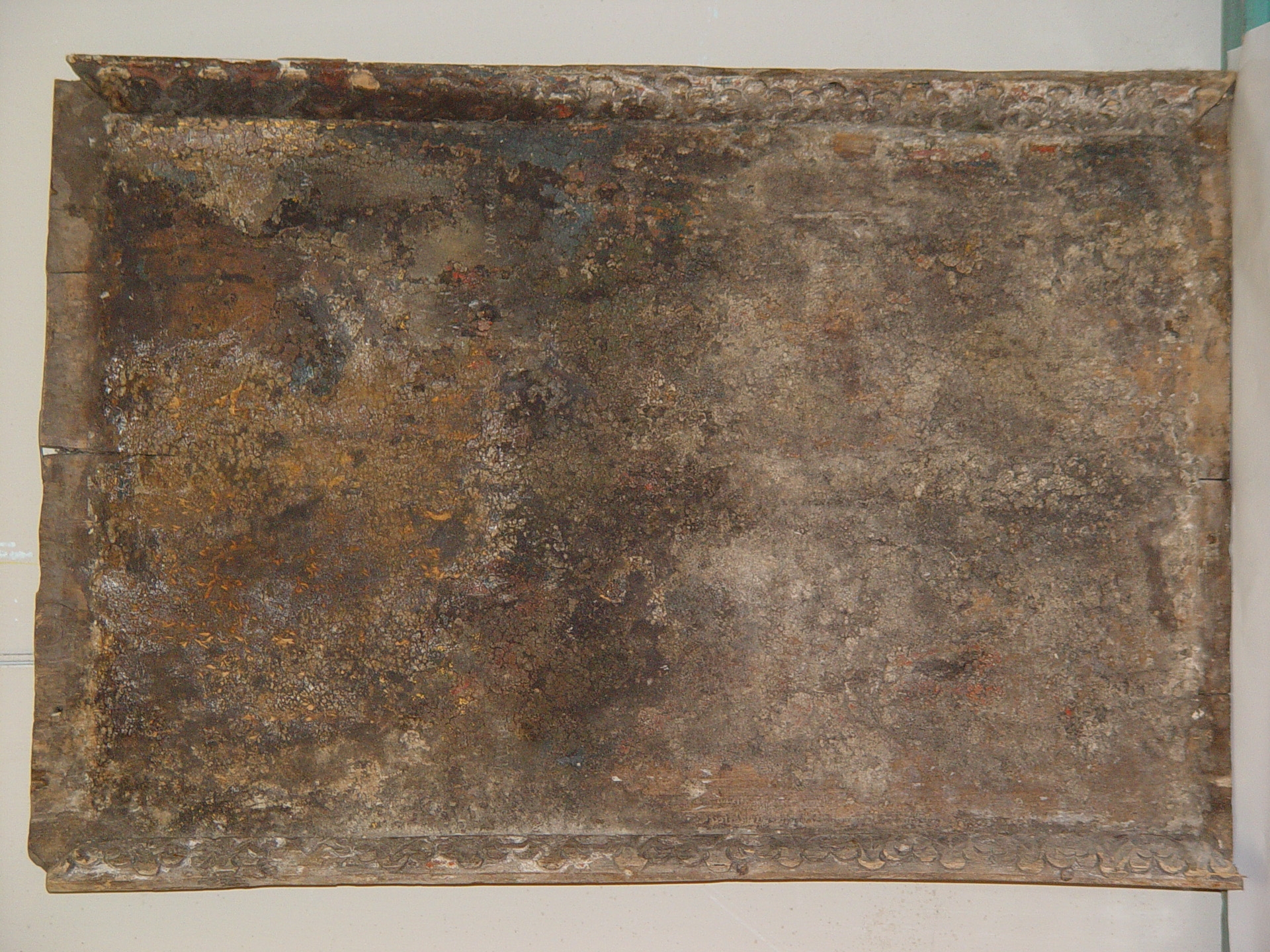 Icoană cu imagine complet degradată, acoperită cu o crustă de murdărie, verniul ars, descompus. S-au păstrat două fragmente verticale de ramă sculptată în relief, cu motiv vegetal, aplicate la marginea suportului.