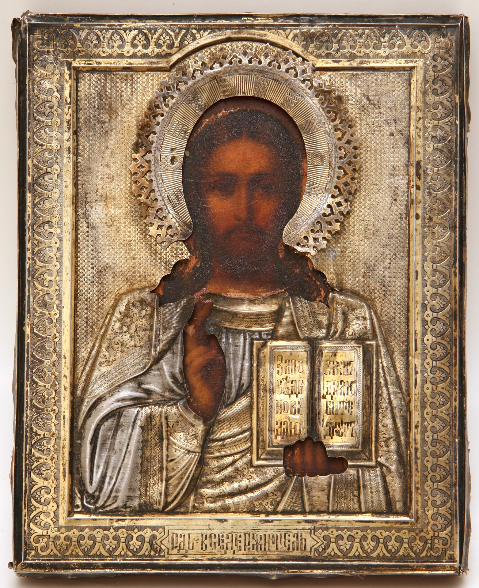 Este reprezentat frontal, până la brâu, chipul lui Iisus Hristos, Pantocrator. Cu mâna dreaptă blagosloveşte, în mâna stângă - Evanghelia descisă. Ferecătura acoperită pe toată suprafaţa, în afară de faţă şi mâini. Pe perimetru - ornament.