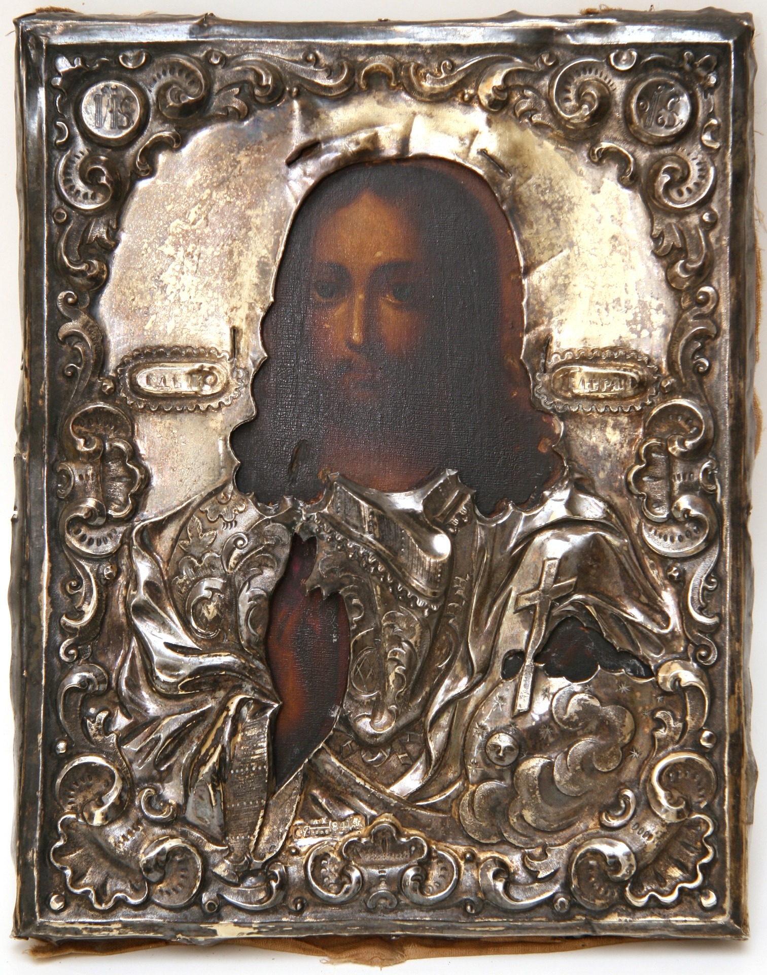 Este reprezentat frontal, până la brâu, chipul lui Iisus Hristos, tip "Atotţiitorul". Cu mâna dreaptă blagosloveşte, în mâna stângă - o cruce. Ferecătura repetă compoziţia, acoperă pe toată suprafaţa în afară de faţă şi mâini. Pe perimetru - ornament.