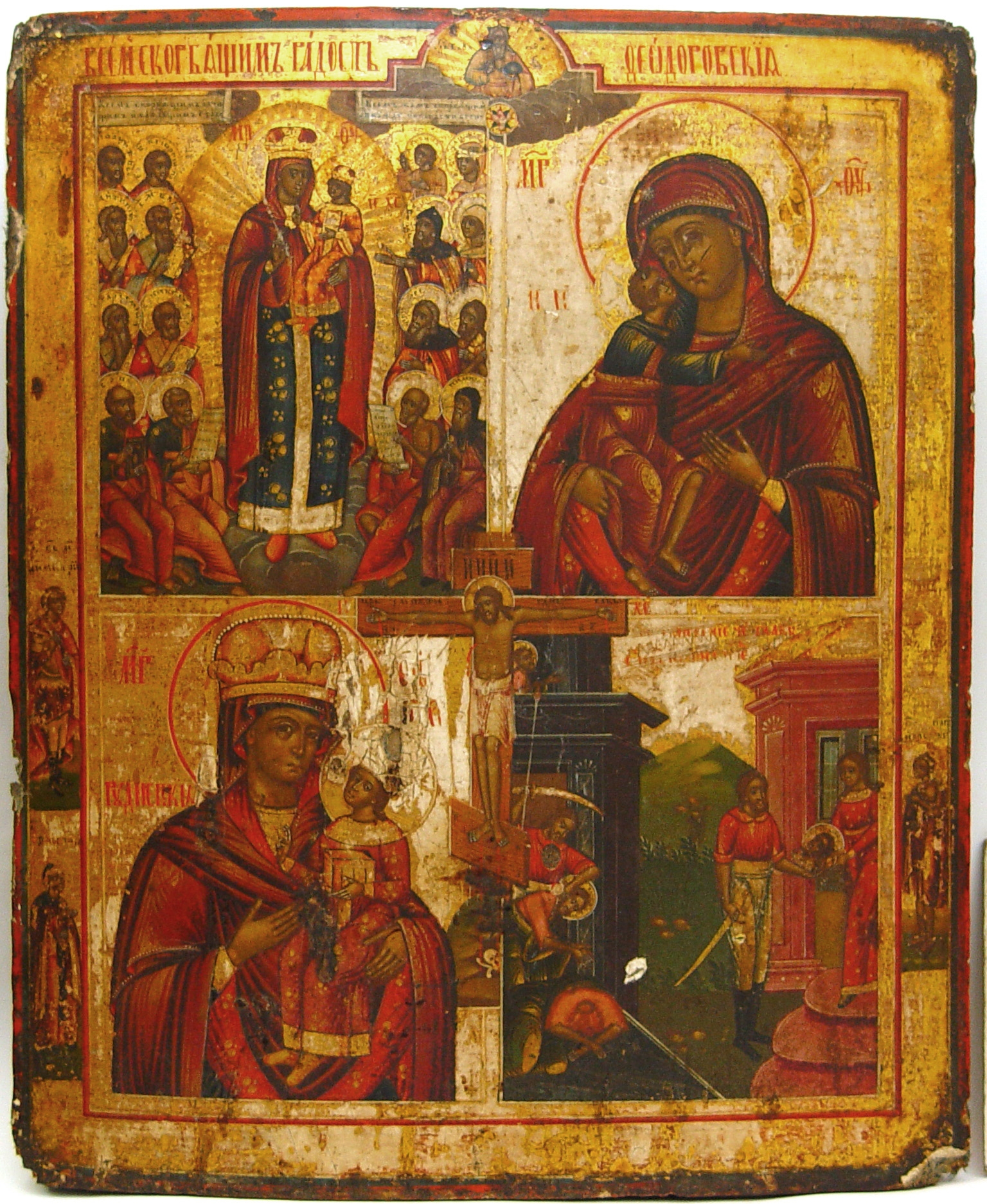 Icoană cu 4 subiecte. Sus stânga - figura Maicii Domnului cu Pruncul pe braţe, înconjurată de mulţi sfinţi şi mucenici. Sus dreapta - chiupl Maicii Domnului cu Pruncul "Feodorovskaia", tip "Eleusa". Jos stânga - chipul Maicii Domnului cu Pruncul, tip "Hodighitria". Jos dreapta - scena "Tăierea capului lui Ioann Botezătorul". Centru - crucifix. Pe margini stânga şi dreapta - chipuri de sfinţi. Sus centru - chipul lui Dumnezeu Savaot. Toate subiectele poartă inscripţii