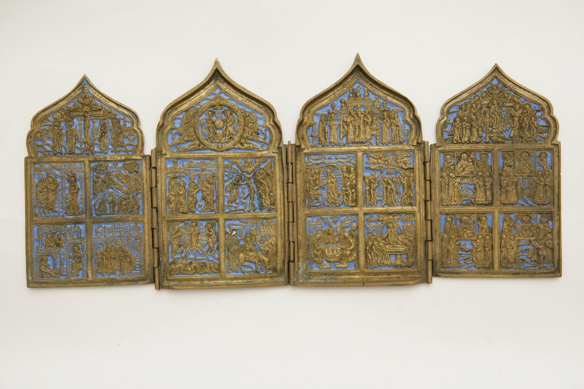 prinse cu balamale. Fon emailat albastru. Scene biblice distribuite în canaturi, fiecare avînd un cadru bulbar deasupra şi 4 registre separate de dungi. Revers: canatul stg cuprinde la centru în cadru ovoidal o cruce cu uneltele patimilor, flancată de 2 coloane şi elemente vegetale, sus - inscripţii.