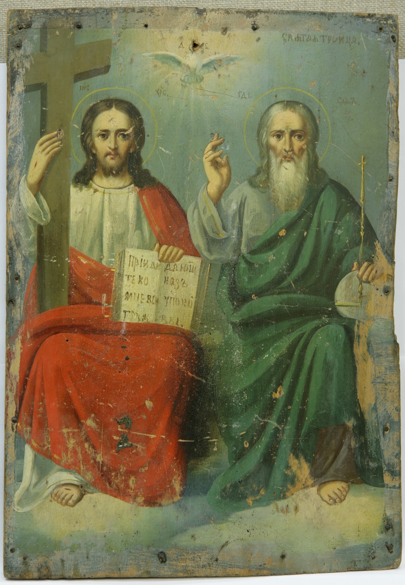 Chipul lui D-zeu Tatăl şi D-zeu Fiul, în poziţie aşezată; nori albi azurii - sub picioarele lor. Fiul are chiton alb şi mantie roşie. Ţine în mîna drp crucea, în cea stg - Evanghelia deschisă, plasată pe genunchi. Tatăl - în chiton alb şi mantie verde, cu mîna drp binecuvîntează, în stg are Sceptrul şi Globul puterii. Sus centru - Duhul Sfînt.