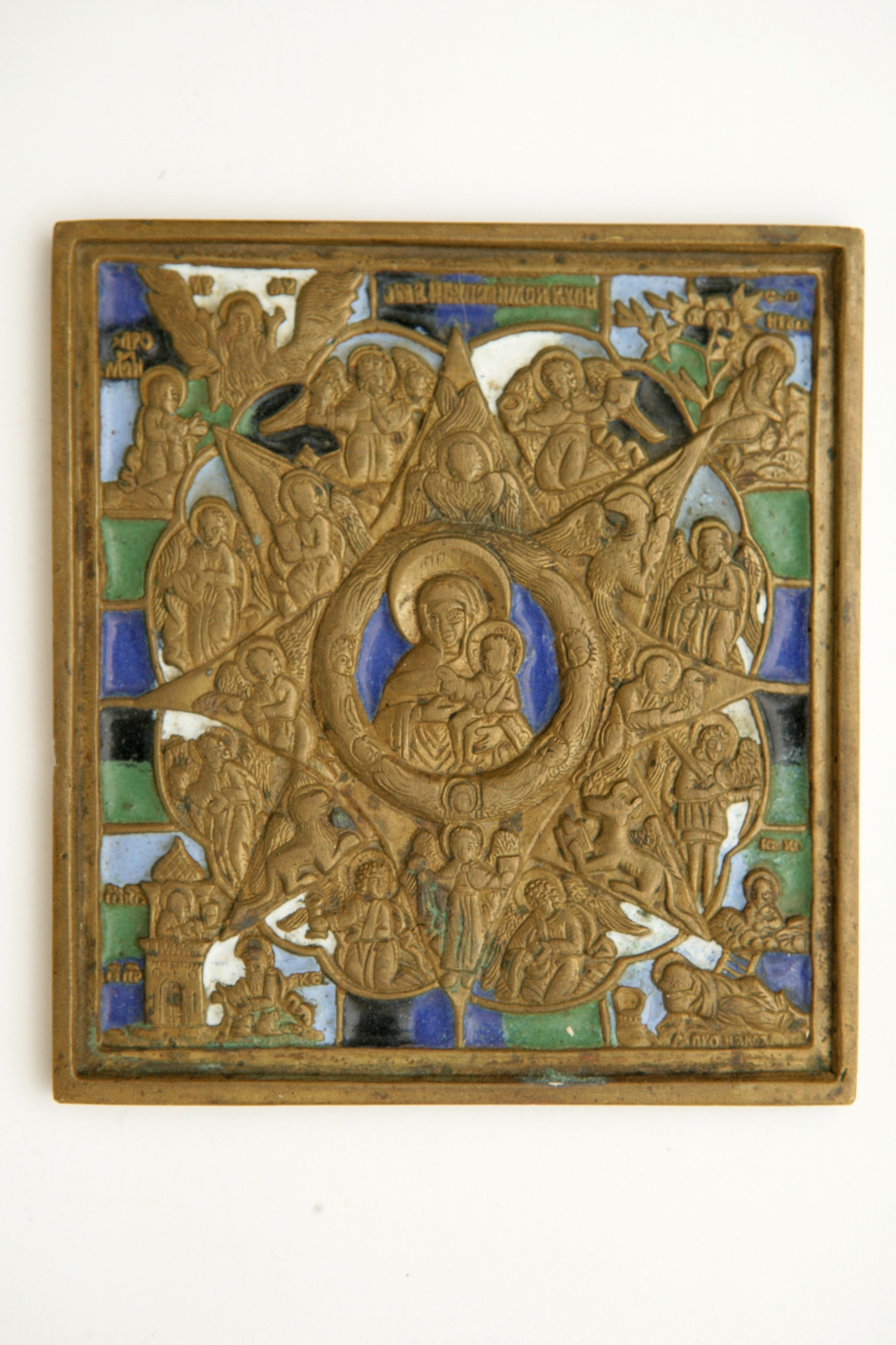 cu fon emailat în verde, alb, albastru închis şi deschis. Maica Domnului (bust) cu Pruncul în medalion, ce este centrul unei stele cu 8 colţuri. Între colţuri: 8 arhangheli cu simbolurile lor. În colţurile iconiţei: omul, leul, viţelul şi vulturul. Cadre secvenţionale şi inscripţii.