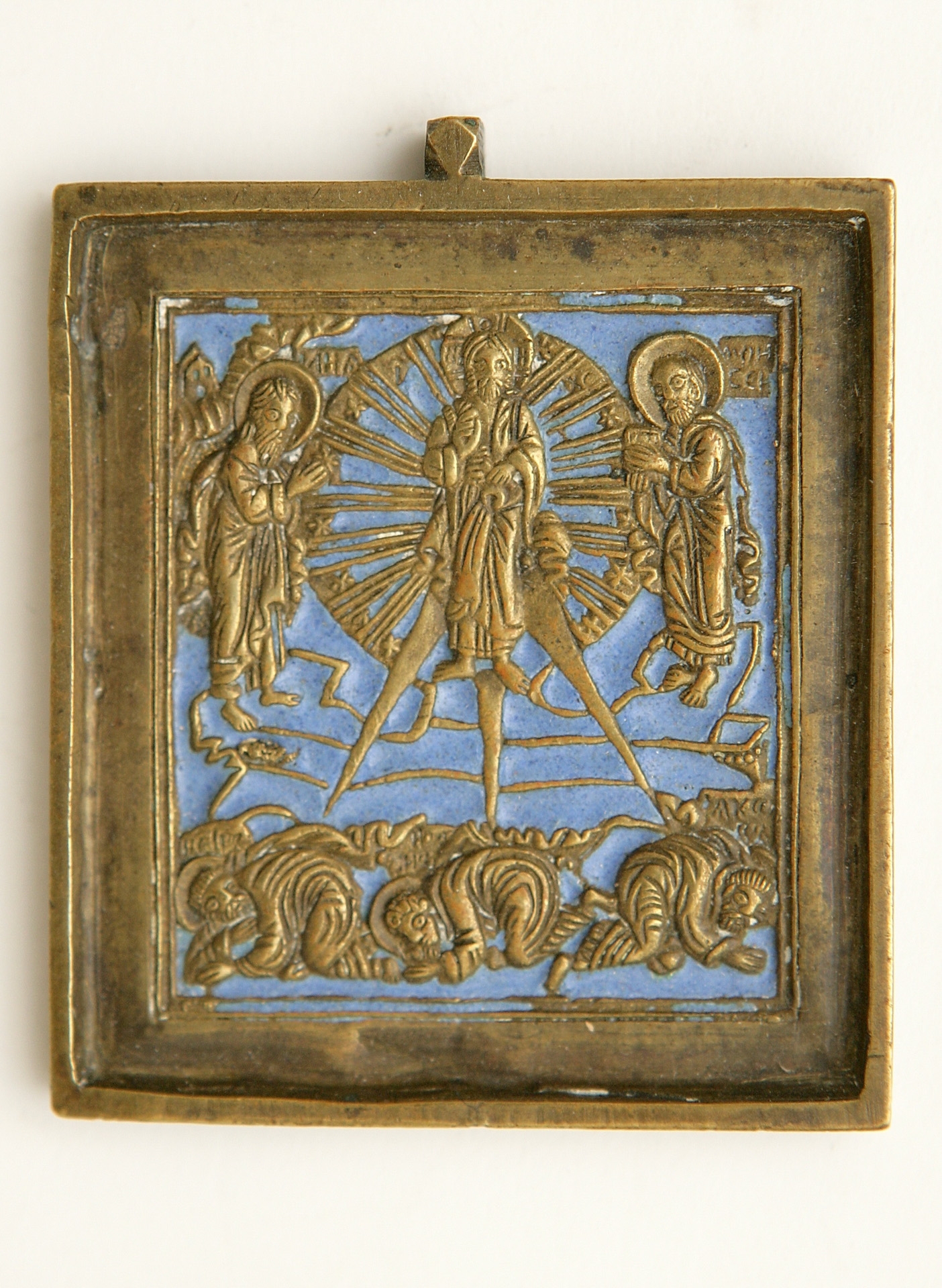 Iisus (centru) flancat de Moise şi Ilie. De la picioarele Sale - 3 raze spre cei 3 apostoli (Petru, Ioan şi Iacob) prăvăliţi la pămînt în momentul schimbării sale în haine de lumină. Cadrul e uşor reliefat pe fon albastru.