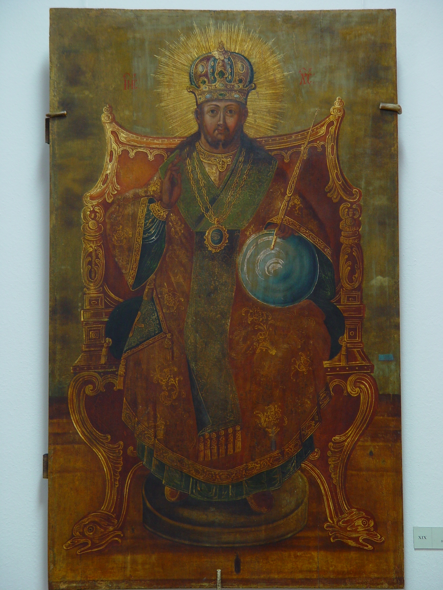 pe fundal verzui, în veşminte de arhiereu, pe cap - mitră, la piept - egolpion, sacos roşu înflorat cu margini aurite, omofor verde împodobit cu 6 ciucuri şi epigonat de aceeaşi culoare. Pe genunchiul stg ţine globul puterii şi sceptrul , iar cu drp - binecuvîntează.