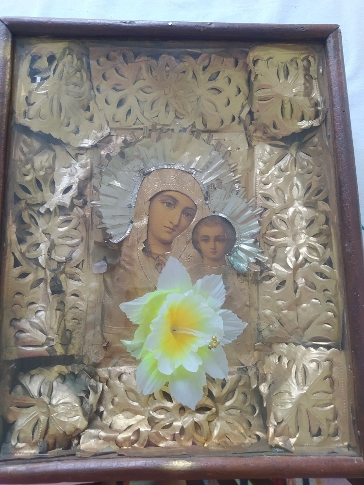 Икона "Матерь Божья с младенцем" под стеклом, в деревянной рамке, родители со стороны невесты дарили икону молодым в знак благословения. Богородица, Божья Матерь или Дева Мария, всегда была и останется одной из наиболее почитаемых у христиан всех конфессий. К ней трепетно относятся и православные, и католики, и лютеране. Именно к ней обращаются в молитве в минуты отчаяния, или прося благословения на дела. Она олицетворяет доброту, кроткость, мудрость, целомудрие и способна творить чудеса. Живущие в вере женщины, ежедневно возносят к ней свои молитвы, прося о семейном счастье, благополучии детей и родственников, благодарят за покровительство. Поэтому, её лик, должен быть в любом доме. Тем более, что на икону Богородицы, цена всегда доступна, чтобы позволить себе этот православный оберег, мог каждый. Данный предмет принес в дар Киров Д.Д ., икона была подарена ему на свадьбу от тещи и тестя.