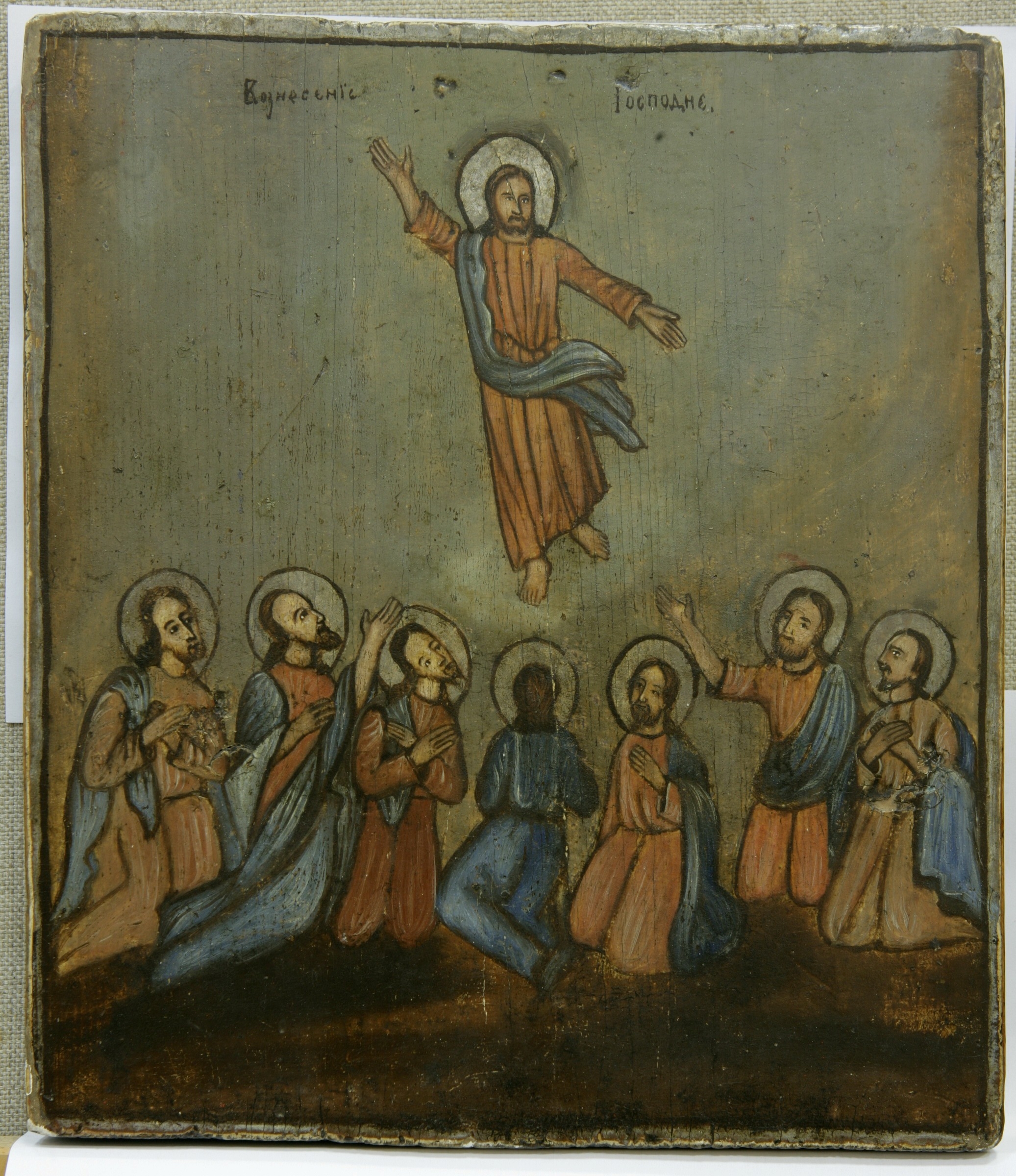Fondal - cer senin. Iisus în slăvi, poartă veşmînt roşu şi manie albastră. Jos: 7 apostoli îngenunchiaţi. Gama: roşu, albastru, brun, ocru, azuriu.