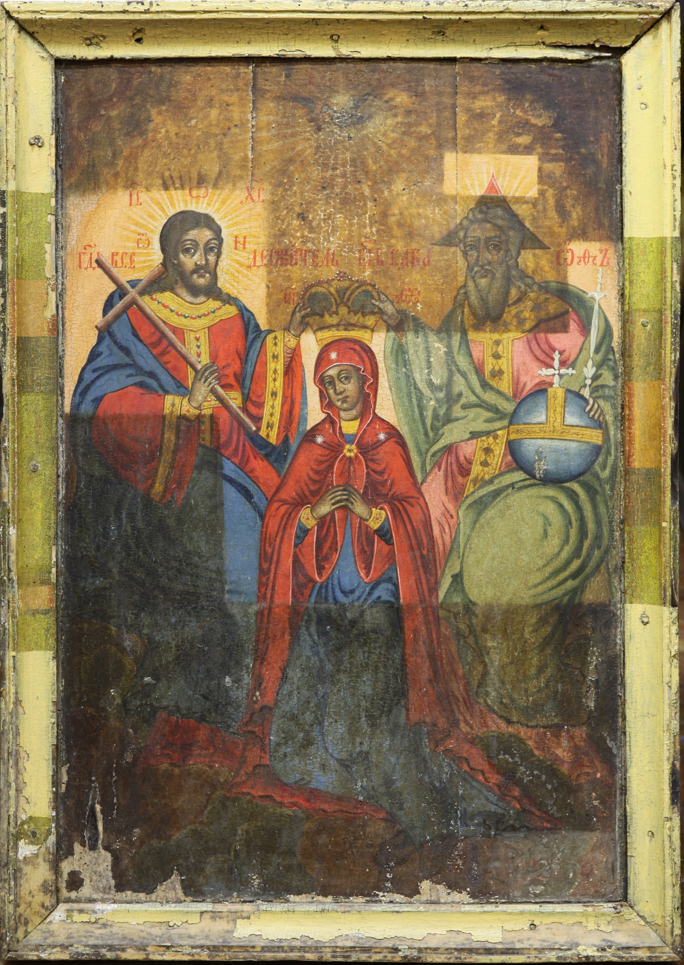 În centru - Maica Domnului îngenunchiată, de asupra capului - o coroană împărătească, înveşmîntată în maforion roşu şi tunică albastră. În drp e Iisus Hristos ce ţine o cruce sprijinită de umărul drp, în stg e D-zeu Savaot cu Globul Puterii. Veşmintele ambilor sunt împărăteşti. În partea de sus - Porumbelul, ce simbolizează Sf Duh şi luminează scena. Chipuri luminate de nimburi.