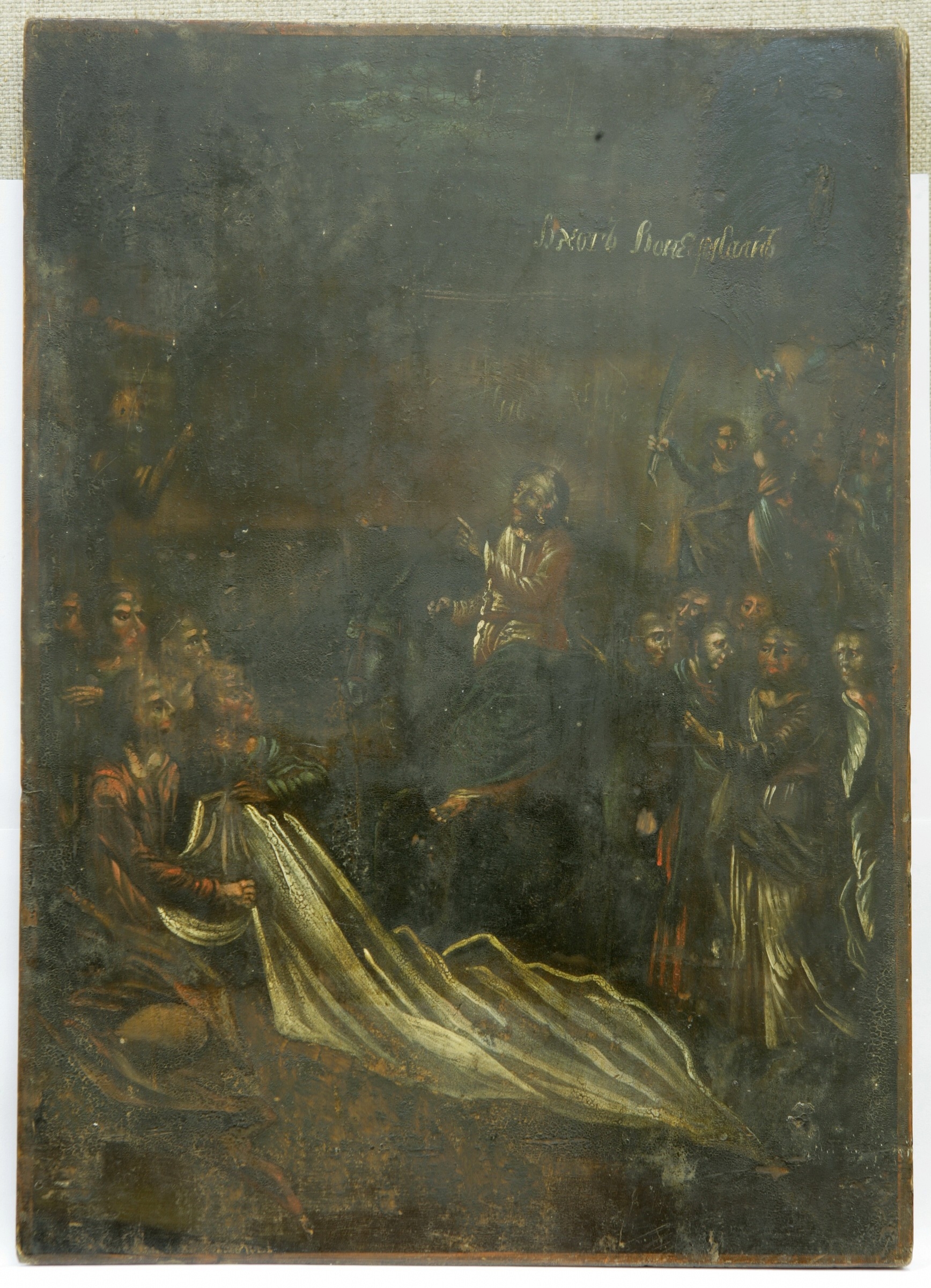 Centru - Iisus călare pe un măgar, înconjurat de mulţime. Stg: 2 persoane aştern o pînză albă în calea Mîntuitorului. Pictura parţial înnegrită.