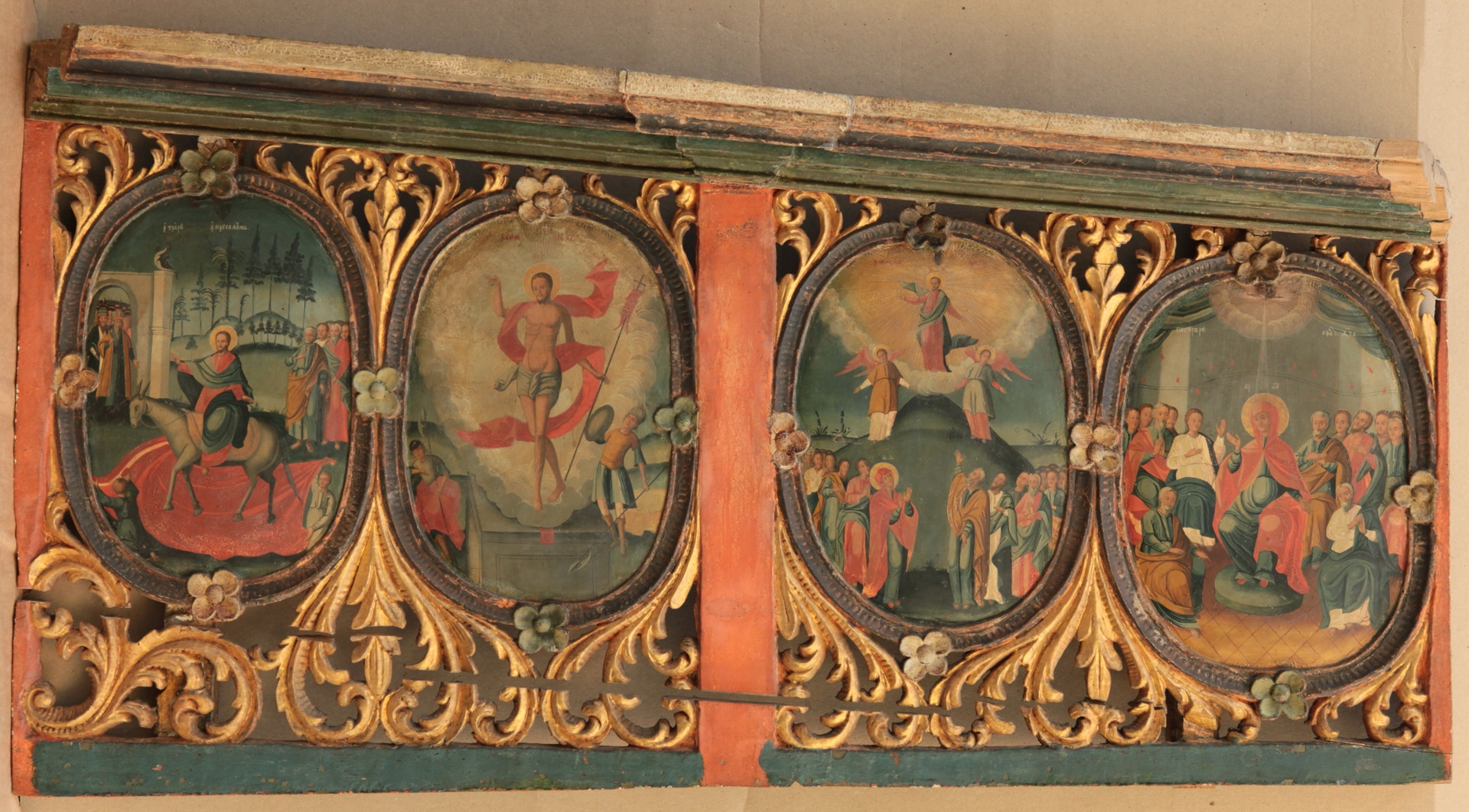 Icoană diptic. În fiecare registru - 2 scene evanghelice pictate, încadrate în ovale, înconjurate de ornament ajurat, sculptat în lemn, aurit. Gama: roşu, albastru, verzui, ocru şi cafeniu.