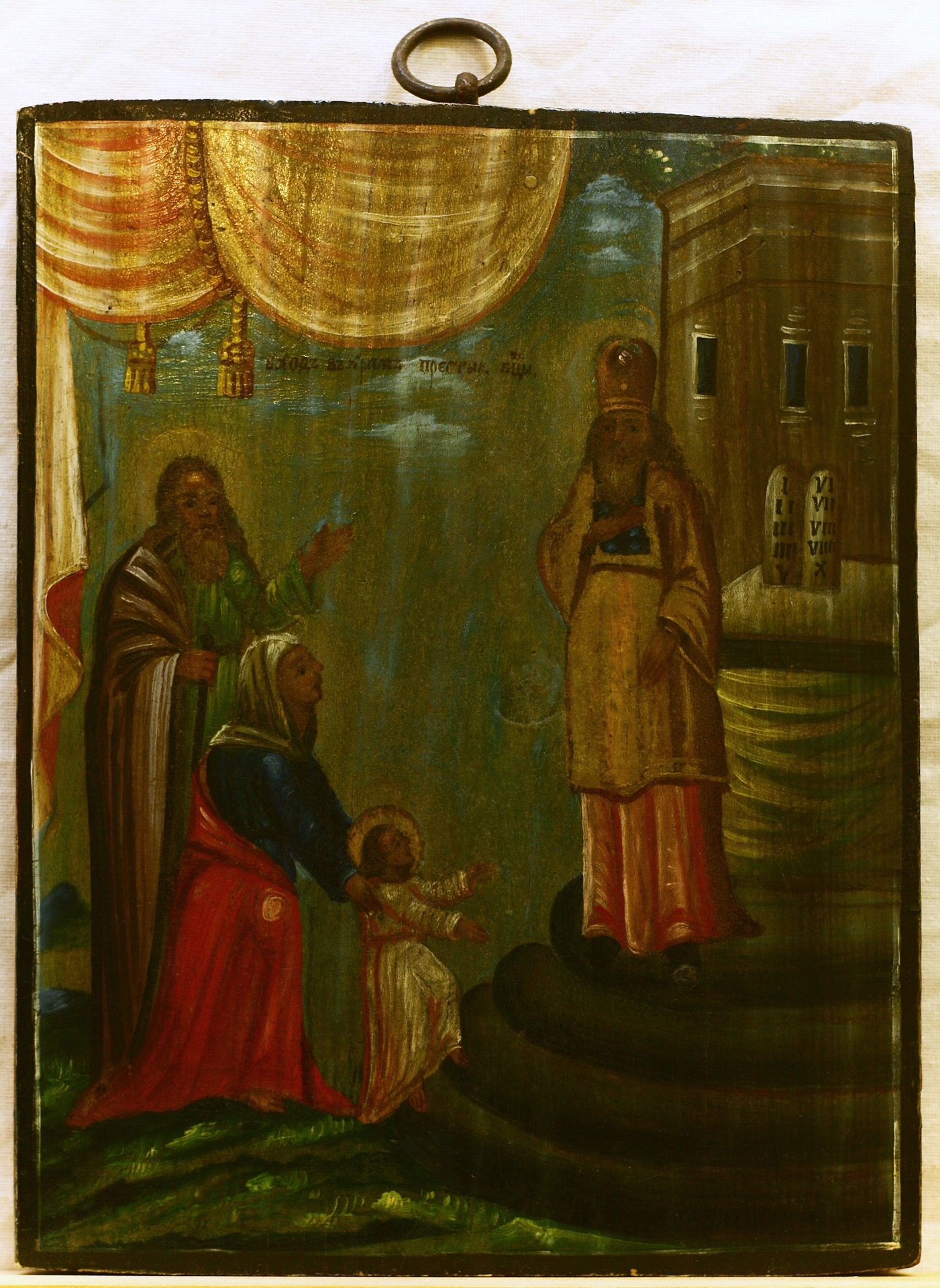 Interior. Ioachim şi Ana (stg) în picioare, ţinînd-o pe Fecioara Maria, pe treptele templului (drp). Fecioara e întîmpinată de preotul Zaharia, în spatele căruia se remarcă zidurile templului şi tabla cu cele 10 porunci dumnezeieşti. Stg sus: draperie cu franjuri. Fondal albastru-verzui. Gama: roşu, galben, ocru, albastru, verde.