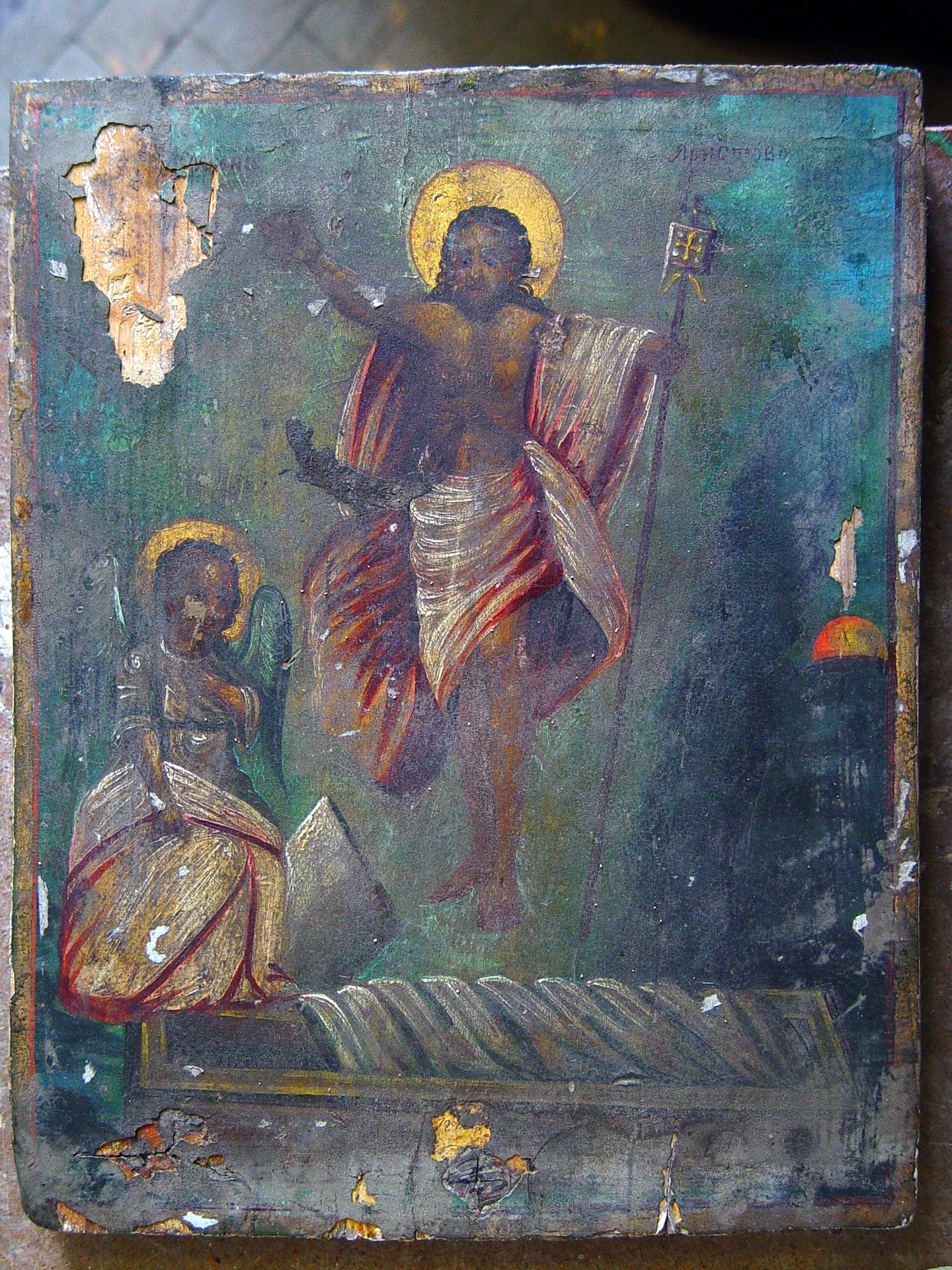pe fundal albastru-verzui, în plină statură, frontal, deasupra mormîntului, binecuvîntează cu mîna drp, iar în stg ţine un steag cu cruce de aur, înveşmîntat cu roşu. Mai este un înger ce ţine giulgiul şi un nour albastru întunecat.
