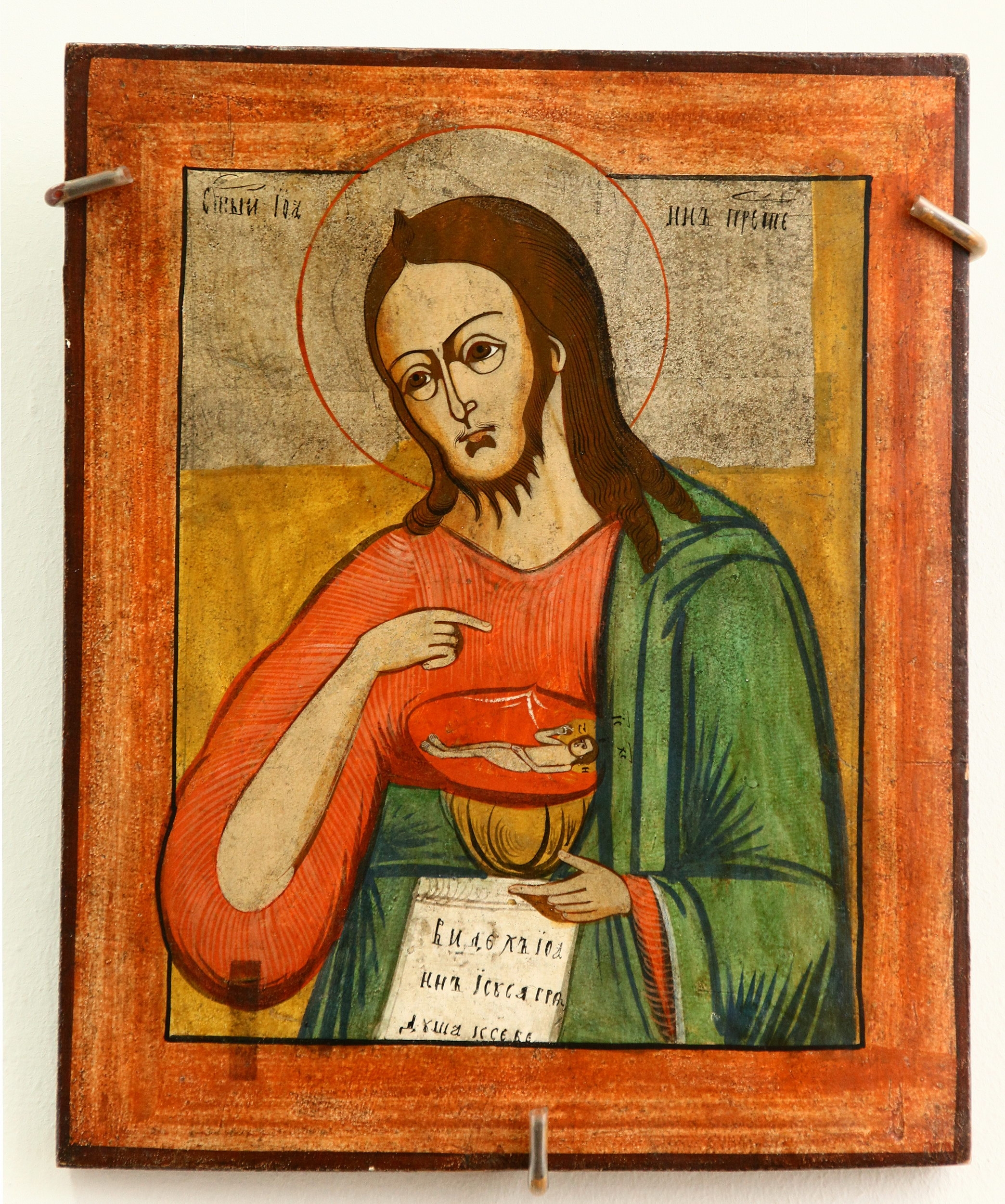 pînă la brîu, capul aplecat uşor spre umărul drp. Ţine în mîna stg un sul deschis şi un potir în care se remarcă chipul lui Iisus în poziţie culcată. Cu mîna drp Sf. Ioan indică spre potir. Poartă chiton roşu şi mantie verde. Nimbul e conturat cu roşu. Fondal: gri (sus), ocru (jos). Icoana are margine roşie.