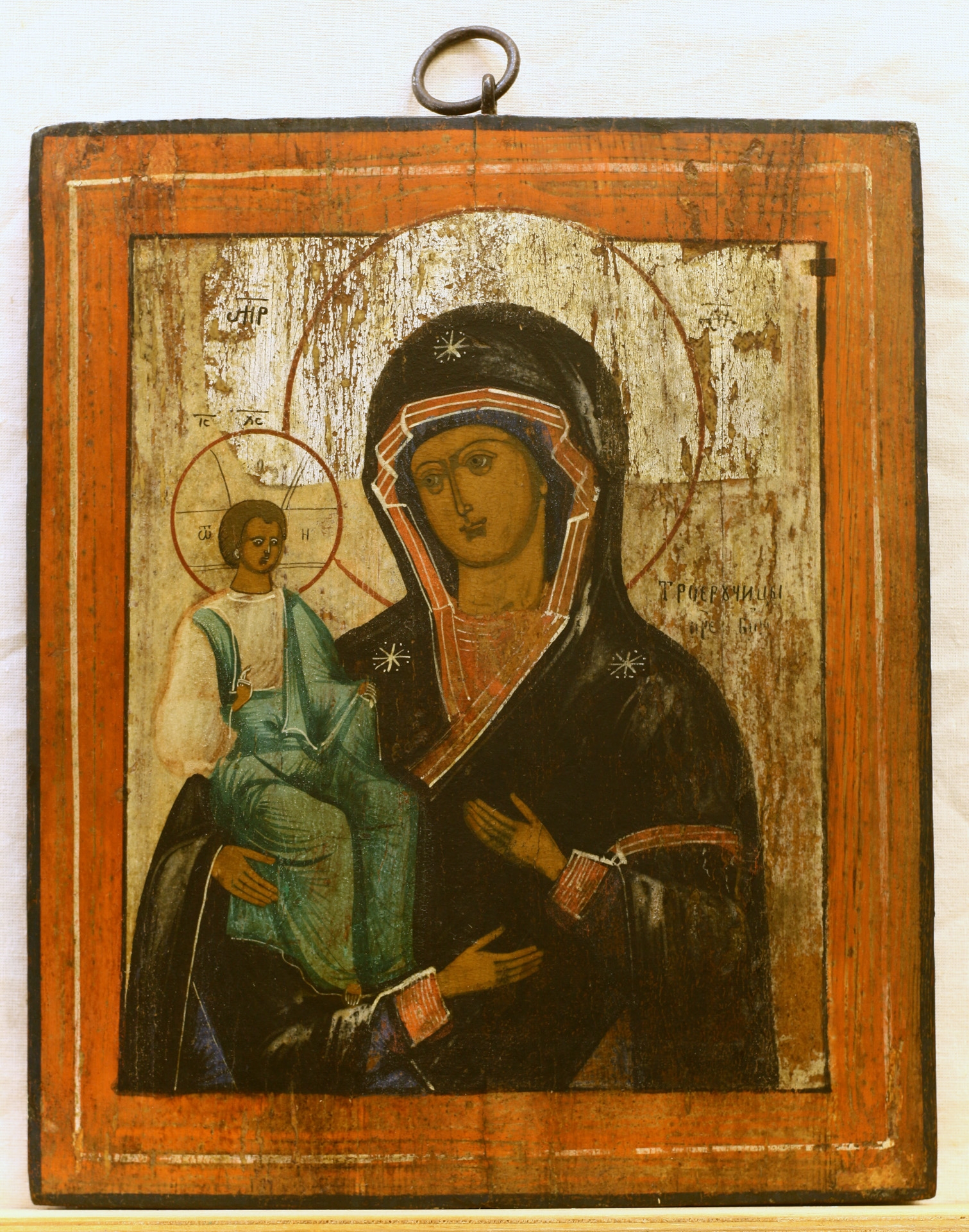 bust, ţine pe braţul drp Pruncul. Ea poartă maforion negru. Pe umeri şi frunte - cîte o stea. Pruncul e în chiton alb şi himation verde. Fondal parţial argintiu. Margine cafeniu-roşcată. Sub picioarele Pruncului este o mînă.