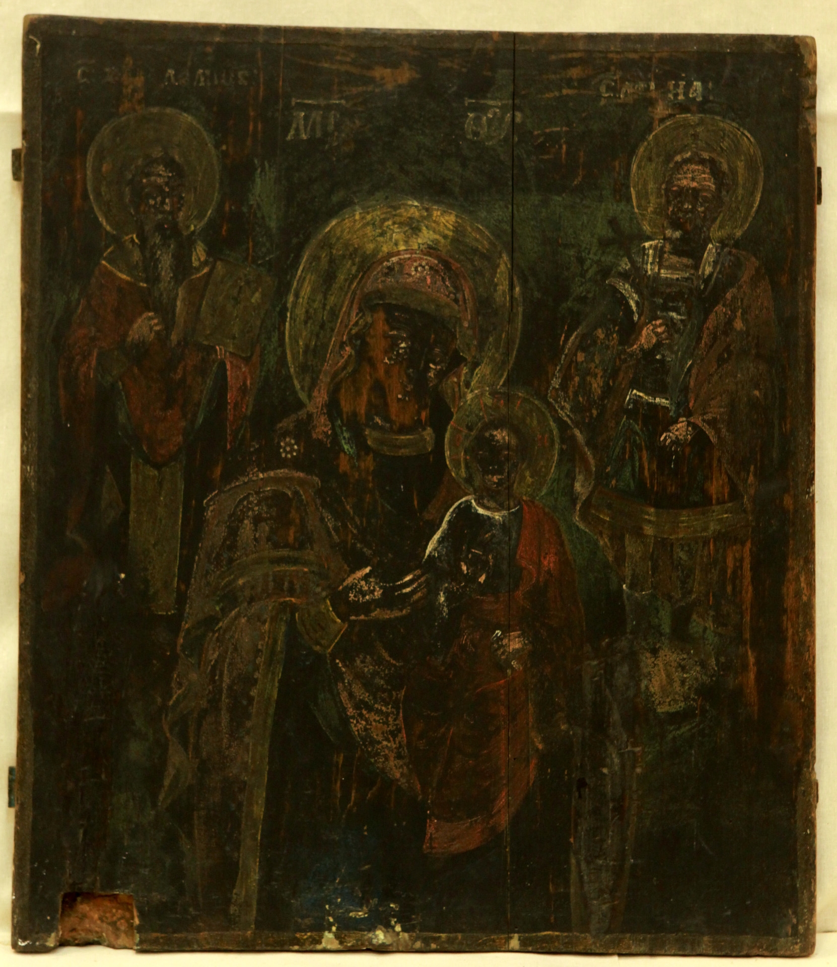 Chipul Maicii Domnului (pînă la genunchi) ţine în braţul stg Pruncul Iisus. Capul Fecioarei e uşor aplecat către Prunc. Iisus ţine într-o mînă un sul. Stg - Sf. Haralampie ţine într-o mînă o cruce, în alta - Evanghelia. Drp - Sf. Mucenic Mina ţine în drp crucea. Ambii în plină statură. Gama: ocru, roşu, negru, verde.