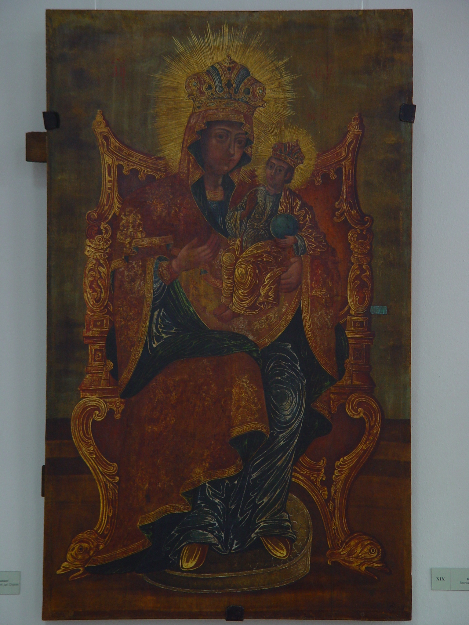 Maica Domnului pe tron impozant cu elemente baroc, reprezetată ca Împărăteasă. Ea ţine Pruncul Iisus pe braţul stg, cu mîna drp indică spre el. Pe cap Ei au coroane bogat ornamentate şi nimburi sub formă de raze. Ea e în maforion roşu cu margini aurite şi tunică albastră. Iisus - în chiton verde şi himation roşu cu blocuri aurite, în mîna stg ţine Globul Puterii, iar cu drp binecuvîntează.