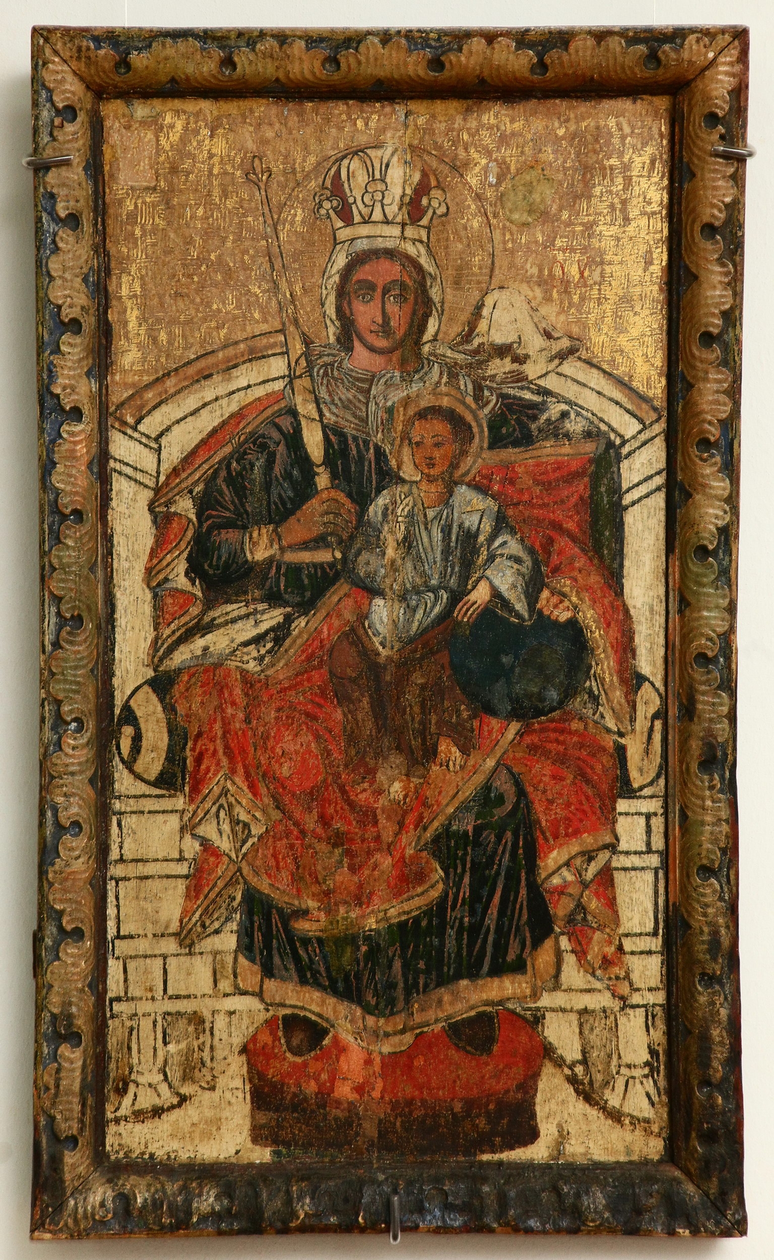 pe tron, ţine pe genunchiul stg Iisus Pruncul şi Globul Puterii, în mîna drp - Sceptrul Puterii. Pruncul binecuvîntează cu mîna drp, cu stg se sprijină de Globul Puterii. Ea poartă chiton verde închis şi mantie roşie, acoperămînt alb şi coroană împărătească pe cap. El poartă chiton azuriu şi himation brun. Rama e ornamentată în relief cu sculptură de lemn. Fondal ocru.