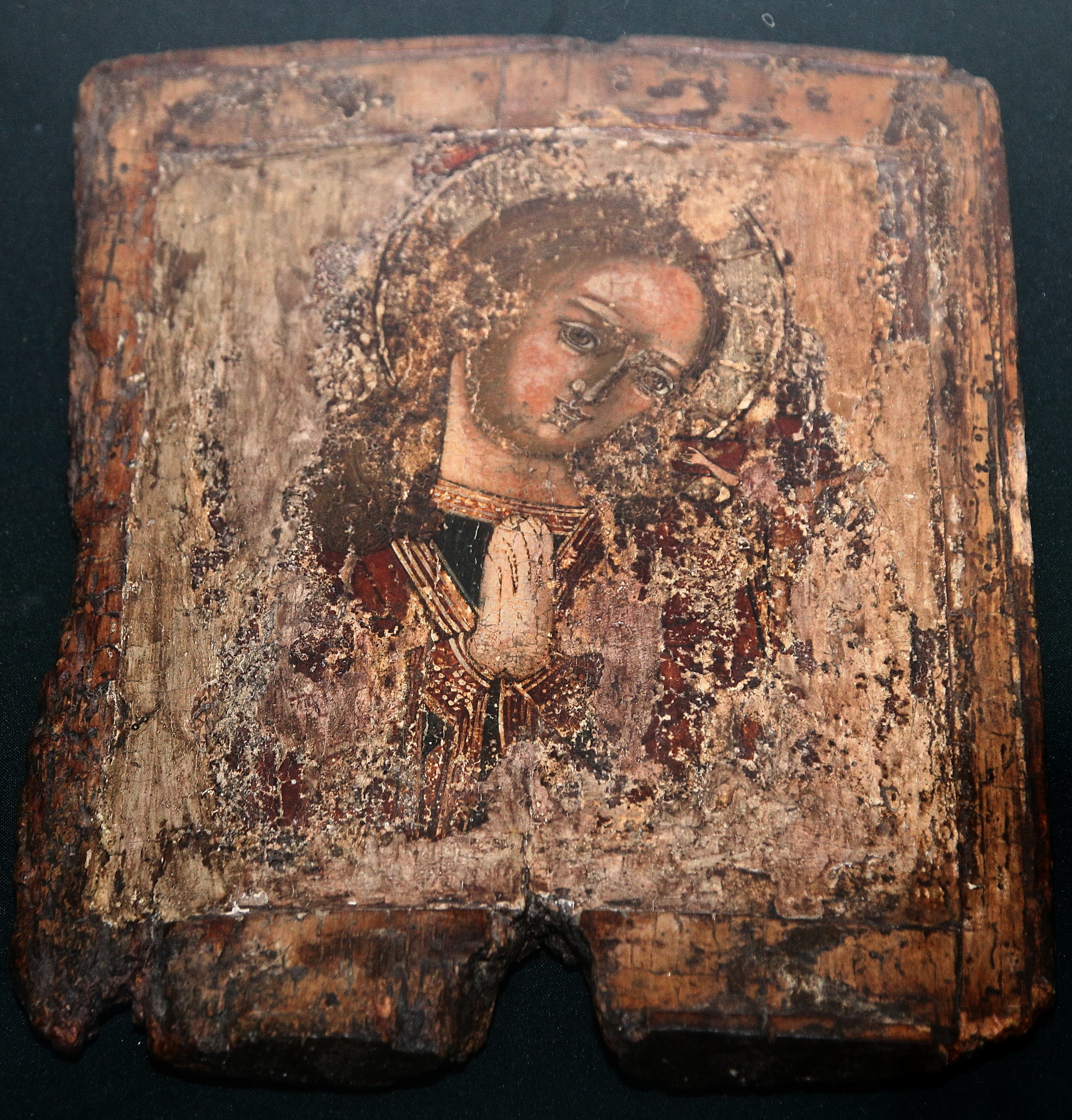 bust. Ţine mîinille împreunate în rugăciune. Poartă veşmînt maro de sub care se remarcă o tunică verde. Capul e descoperit şi uşor aplecat spre drp. Lîngă umărul stg se remarcă Hristos răstignit. Stratul cromatic a fondalului e parţial pierdut.