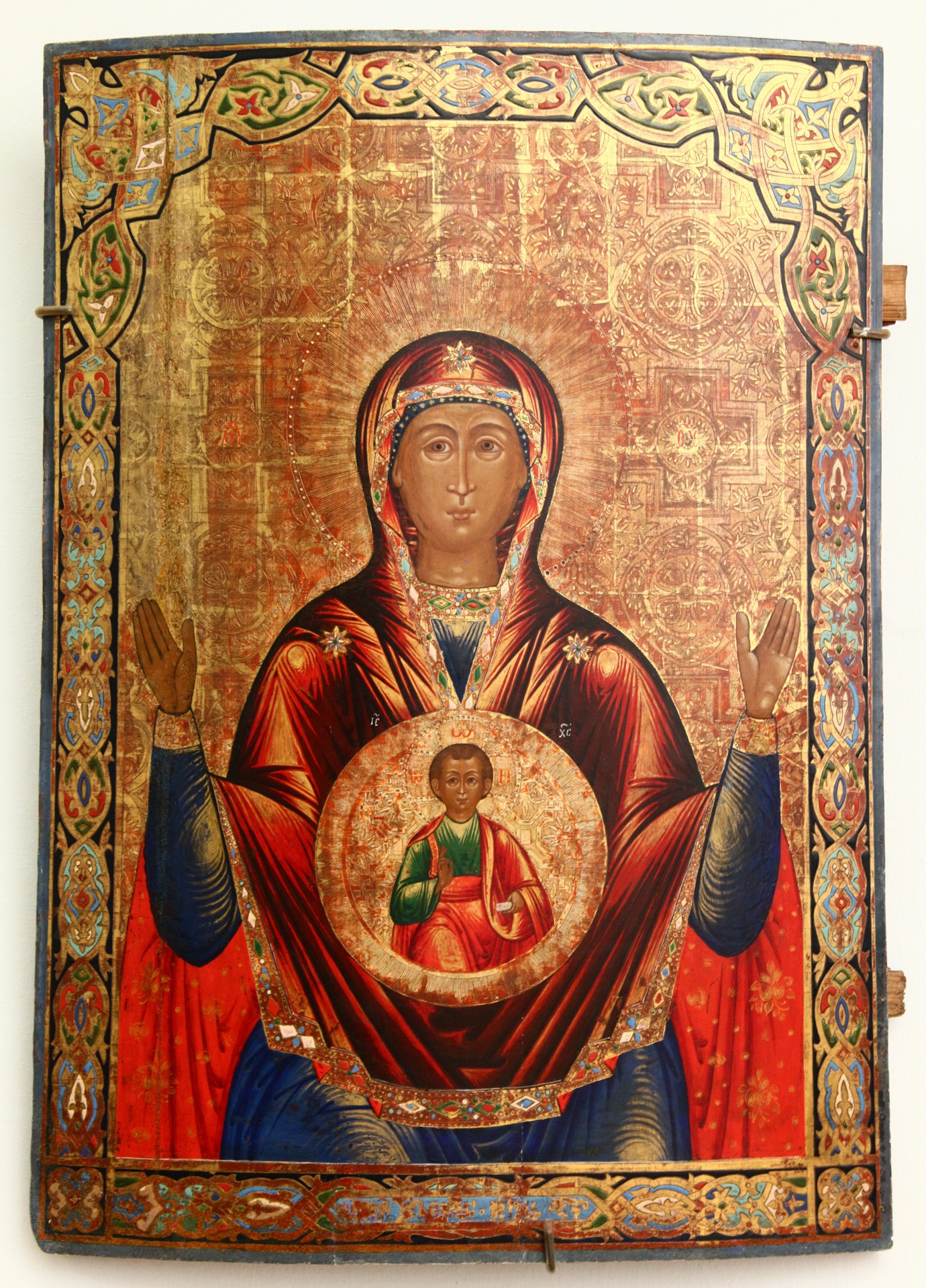 Pe fondal auriu, cu ornament gravat - chipul Fecioarei pînă la brîu, cu mîinile ridicate, îndoite la cot, cu palmele desfăcute, ridicate spre cer. Pe frunte şi umeri străluceşte cîte o stea. Poartă tunică albastră şi maforion roşu. Pruncul Iisus (bust) e redat la pieptul Fecioarei, încadrat în medalion. Marginea conţine ornament gravat şi reliefat din smalţ multicolor.