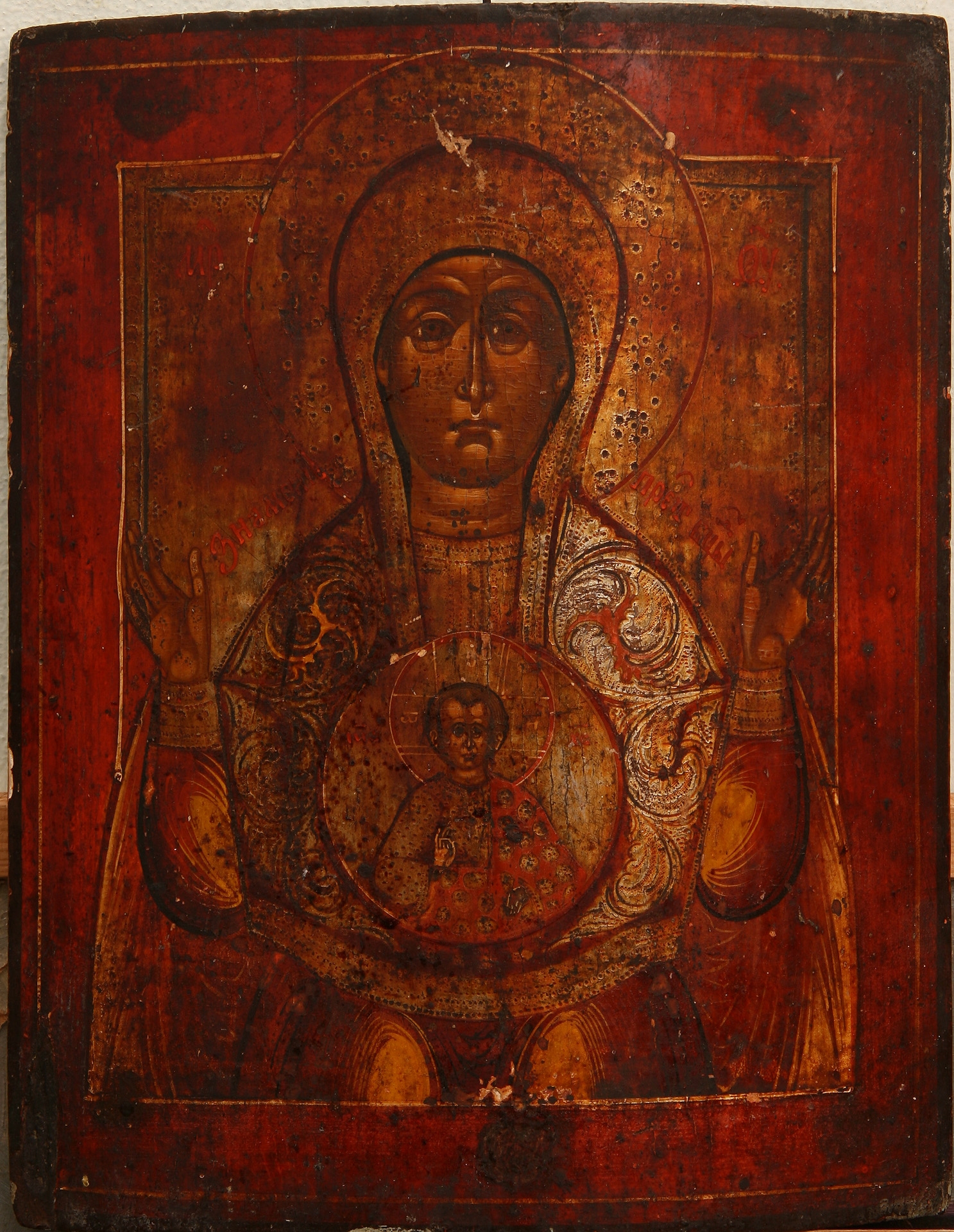 Icoana cu Maica Domnului în ipostază de Orantă (bust). Poartă maforion auriu cu ornament vegetal. Mînile ridicate, îndoite la cot, palmele îndreptate spre cer. Pruncul Iisus (bust) e redat la pieptul icoanei, încadrat în medalion. Inscripţii de asupra umerilor Maicii Domnului şi lîngă nimbul lui Iisus în slavonă.