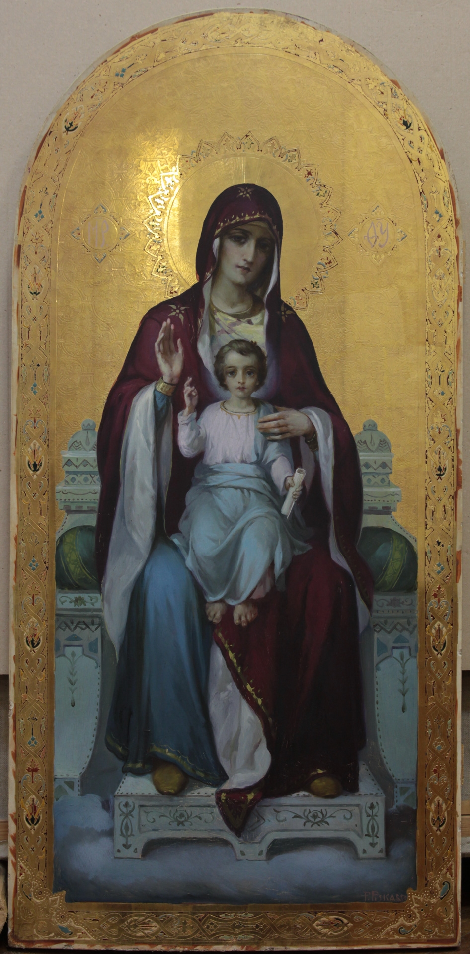 Poartă maforion roşu. Cu mîna stg susţine Pruncul Iisus aşezat pe genunchii Ei (centru). Mîna drp e ridicată la nivelul umărului. Pruncul poartă chiton roz şi himation azuriu; ţine într-o mînă un sul, cu alta - binecuvîntează. Fondal auriu. Marginea nimbului Fecioarei are ornament denticular, în email. Partea de sus a icoane e de formă arcuită. Pe perimetru - ornament ştanţat în foiţă de aur, ornament în email.