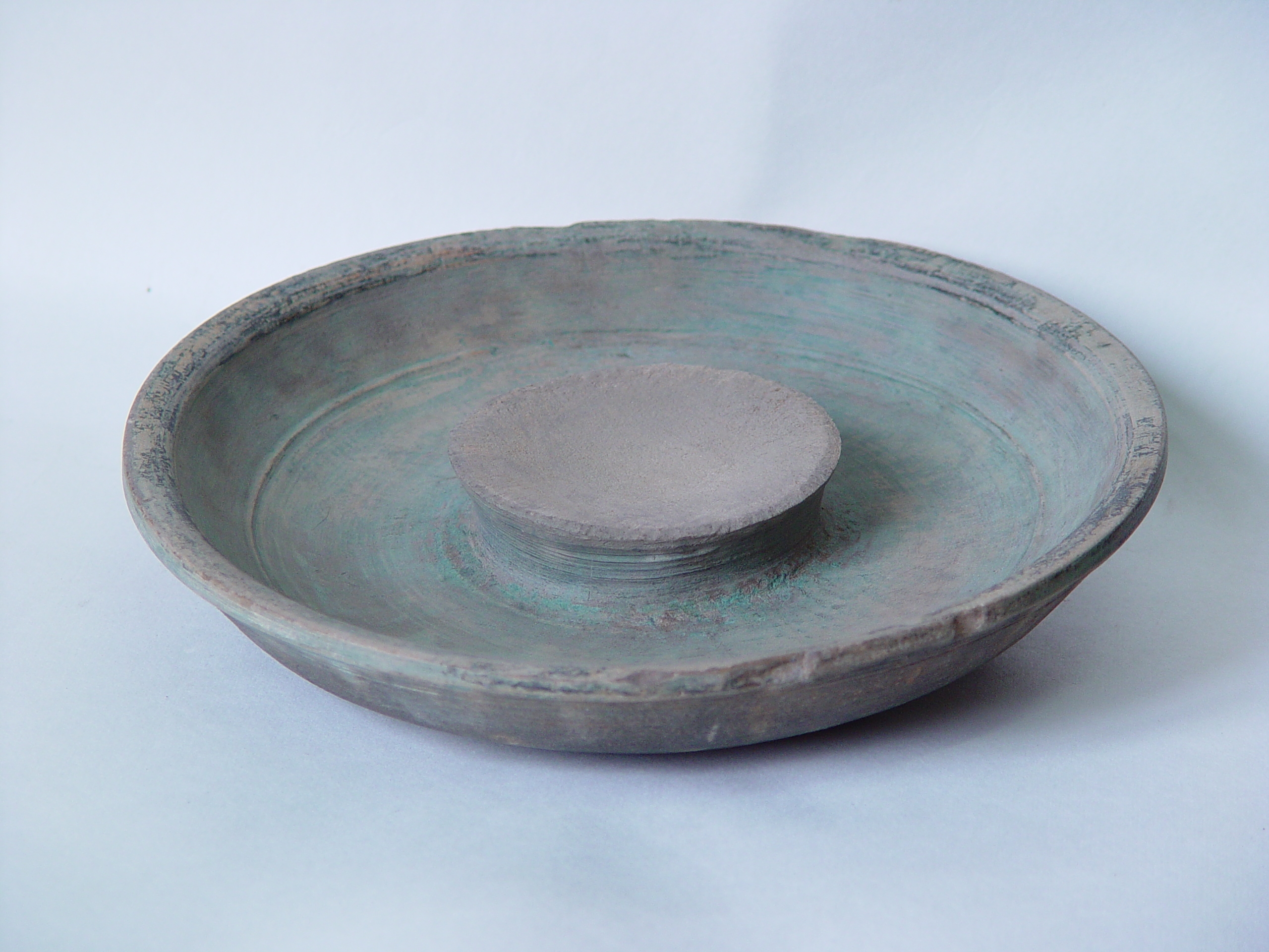 circulară, adîncită, pe fund e plasat un cilindru proeminent, marginile cu pierderi, tempera albastră-verzuie.