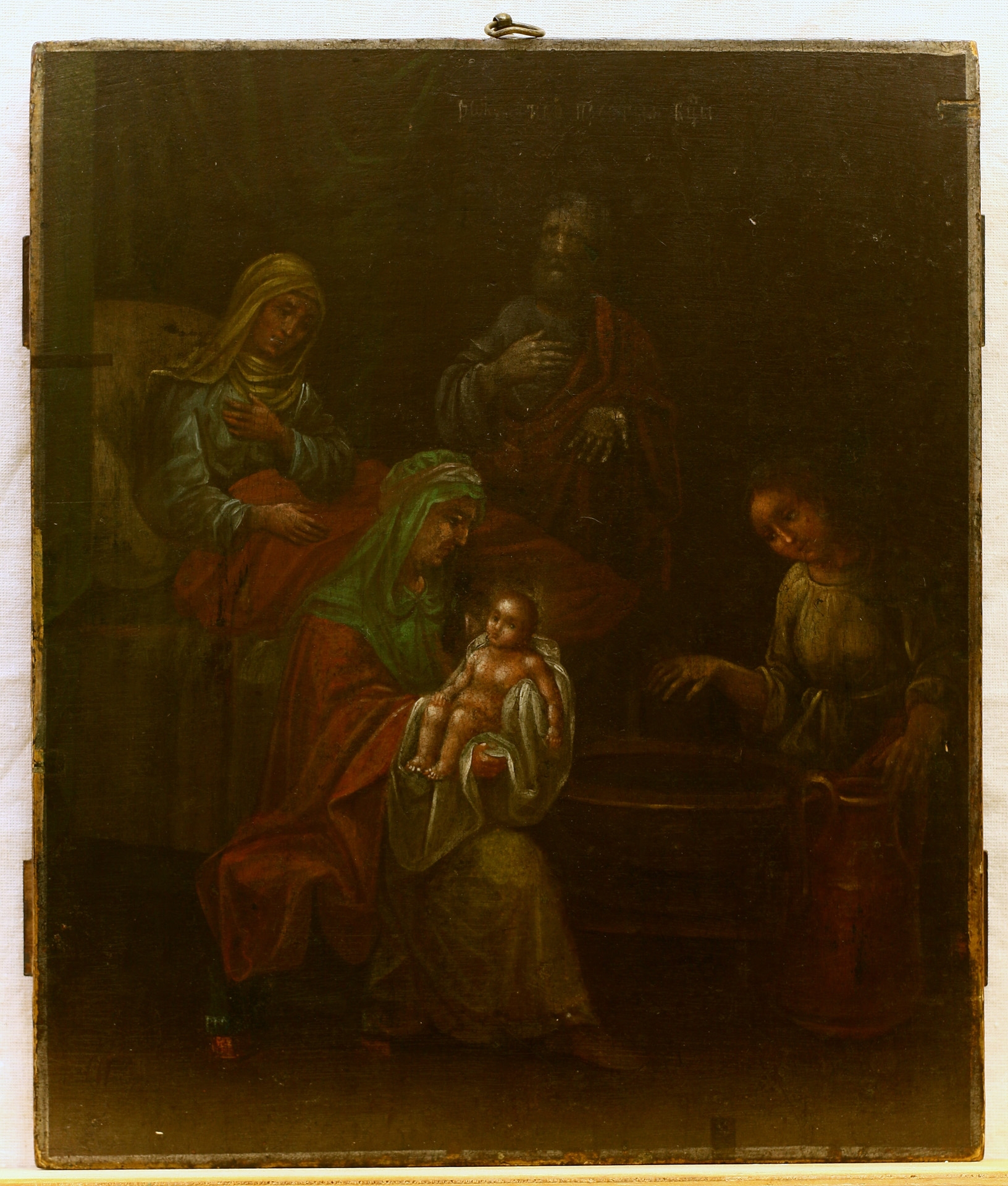 Scenă de interior. Centru: femeie aşezată, în haine de epocă, ţine în braţe un prunc (Fecioara Maria). Alături - vas mare (cristelniţă) şi o femeie (moaşă) aplecată asupra vasului. În preajmă (stg): Sf. Ana în poziţie semiculcată. Plan secund, centru: dreptul Ioachim. Gama: albastru, roşu, galben, verde, ocru, brun.