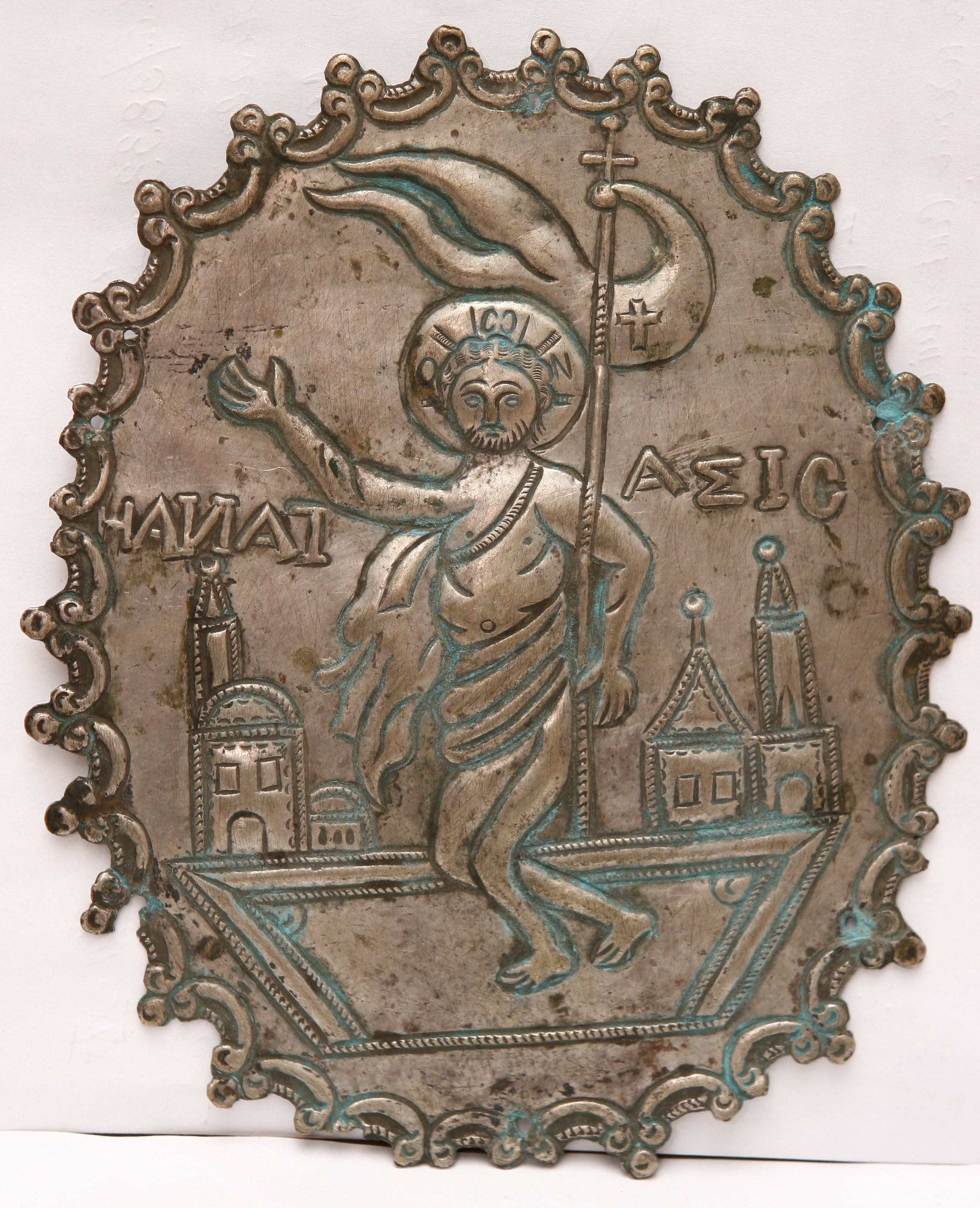 Plachetă de metal, ovală, reliefată. Centru: Iisus în plină statură ţinînd în mîna dreaptă hampa steagului pe care se vede o cruce. În stg şi drp imaginea a 2 temple. Centru, stg şi drp - inscripţii în relief, la fel pe nimbul Mîntuitorului. Margine ştanţată.