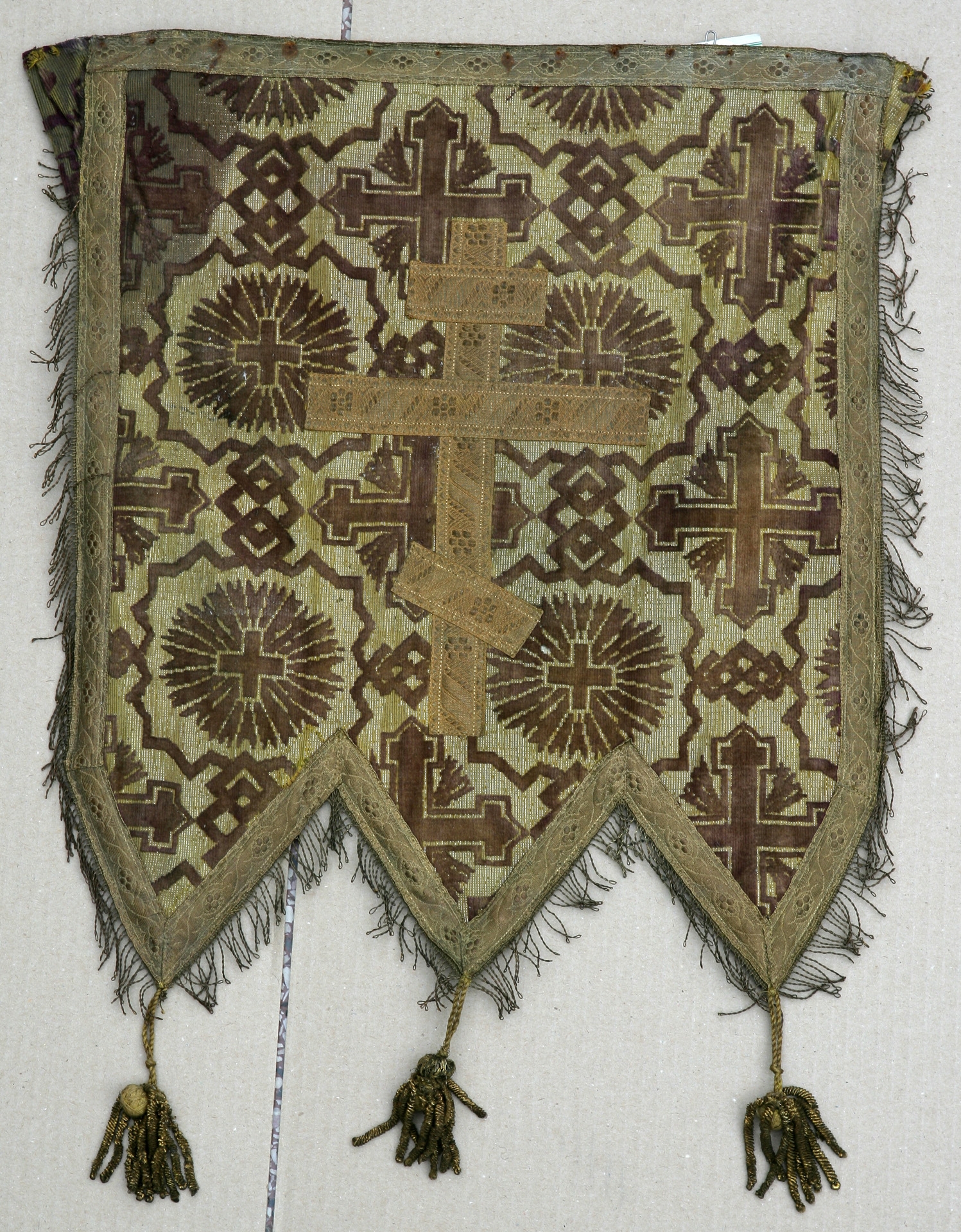 Pînză dreptunghiulară, de culoare olivei, cu fir argintiu. Partea de jos are formă de zigzag, formînd 3 colţuri cu franjuri. Pe margini - galon auriu, cu fir metalic. Ornament reliefat din catifea bordo-cafenie: cruci de format mic şi mare, încadrate în zigzag. Pe centru: cruce de tip rusească, din galon cu fir metalic, ocru. La marginile a 3 laturi - franjuri. Doseală galbenă.