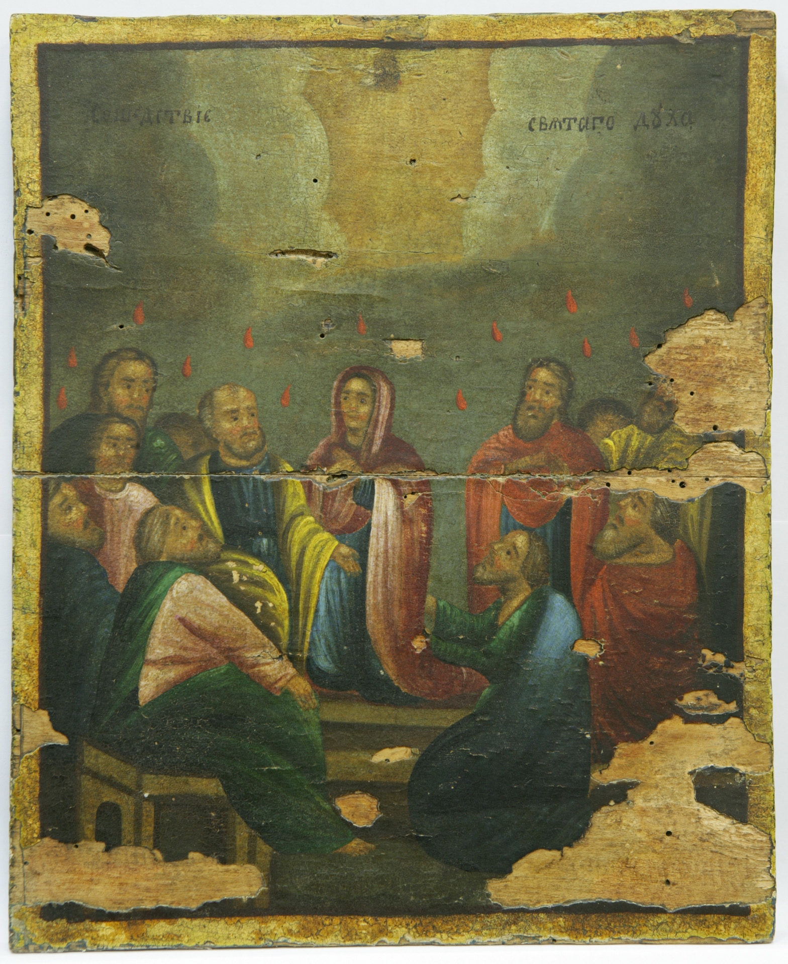 Icoana cu subiectul pogorârii Duhului Sfânt. În centru - chipul îngenunchiat al Fecioarei Maria, cu mâinile împreunate în rugăciune ușor întoarsă spre stânga, poartă veșmânt roșu și albastru. În stânga și dreapta ei sunt redați apostoli în diverse atitudini. În partea de sus a icoanei, centru, prrintre nori - lumina dumnezeească de la care pogoară Sf. Duh, în formă de flăcări de foc. Gama cromatică - galben, verde, roșu, albastru, ocru, roz, brun.