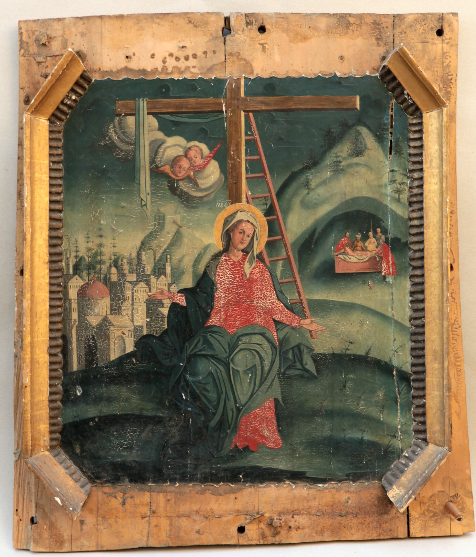 Centru: cruce mare, de care se sprijină Maica Domnului în poziţie aşezată. Fecioara Maria poartă tunică roşie şi mantie albastră, pe cap - acoperămînt alb. Pe unul din braţele crucii e plasată o pînză albă (stg) şi o scară (centru). Fondal: (stg) panorama oraşului Ierusalim; drp - o peşteră şi Hristos culcat în mormînt. Sus stg, printre nori - 2 îngeri.