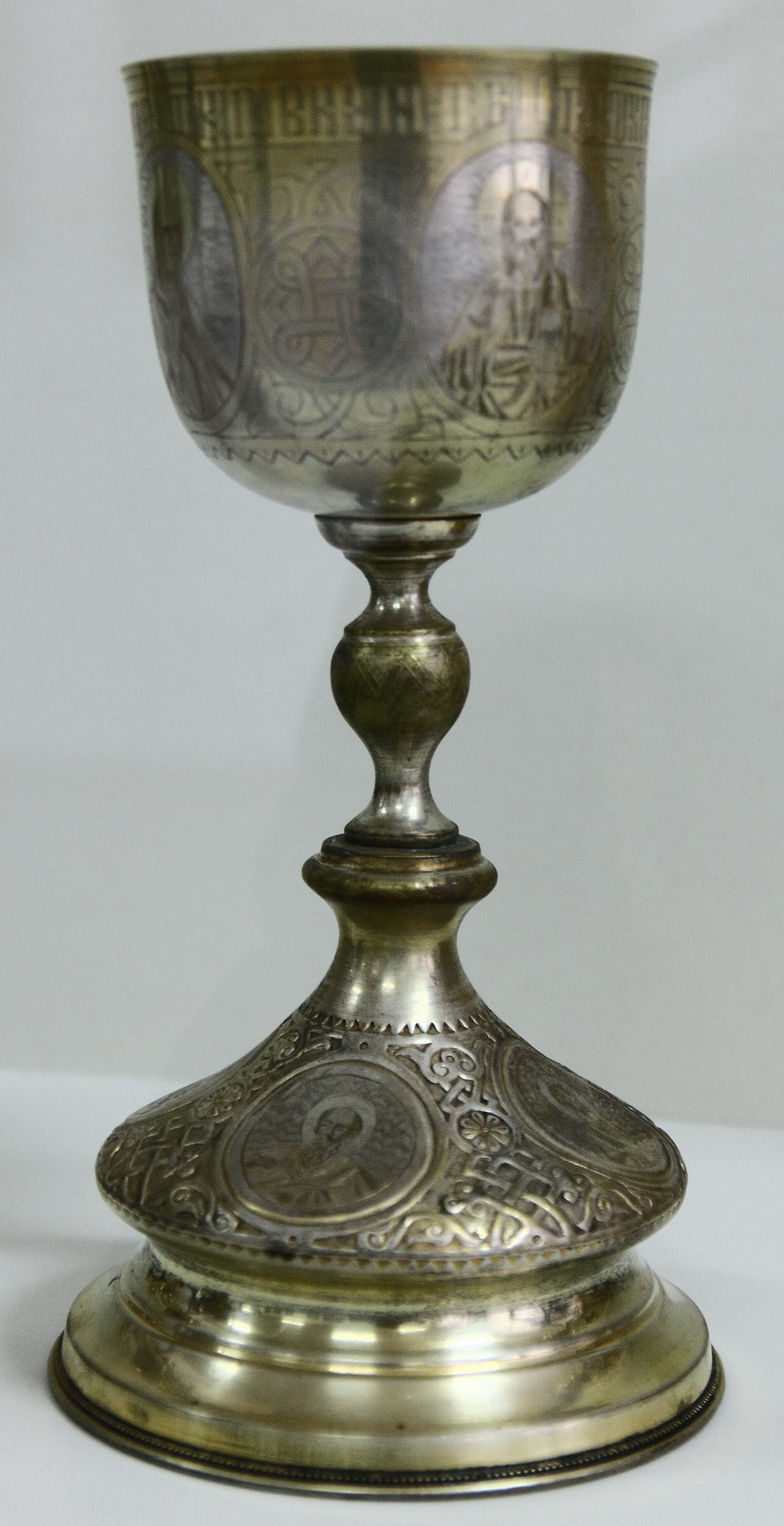 Potir format din cupă cilindrică cu imaginile gravate: Maica Domnului, Uneltele Patimilor, Ioan Botezătorul, Iisus Hristos. Cupa se sprijină pe un picioruş ornat la mijloc cu un bulb, ce evazează către bază în formă de turlă de biserică pe care sunt gravate în medalioane cei 4 evanghelişti.