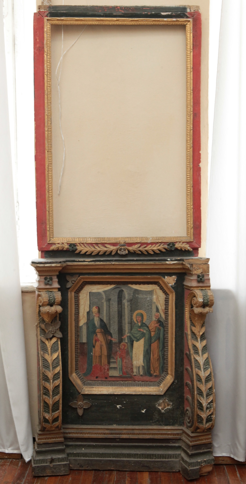 Icoană în cadru de chivot cu 2 registre. E reprezentat un interor cu 4 personaje: Fecioara Maria (centru) priveşte spre preot, Sf. Ana cu mîinile întinse şi Ioachim cu mîinile la piept. În partea inferioară chivotul e decorat cu elemente floral-vegetale sculptate. Cromatica: verde, roşu, auriu etc.