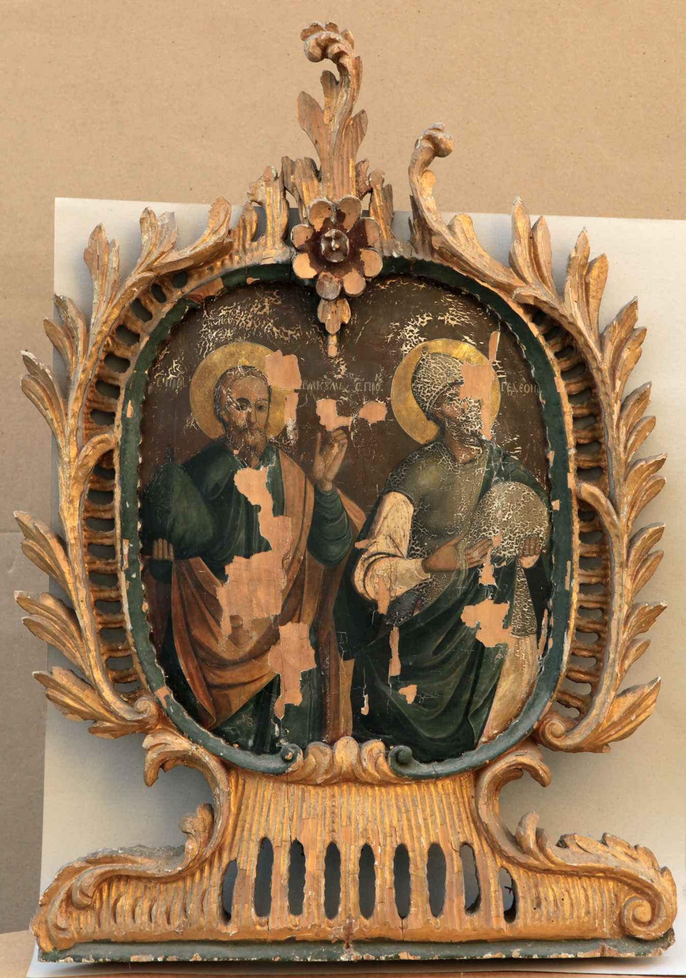 Icoană de formă oval, în ornament vegetal, sculptat în lemn, aurit, ajurat. 2 profeţi, pînă la genunchi, în statură. Unul poartă chiton albastru şi mantie ocru-roz. Ţine într-o mînă macheta unui munte. Altul e în chiton verzui şi mantie albastră. Pe cap - coif (mitră ?). Ţine în mîini un obiect sferic.