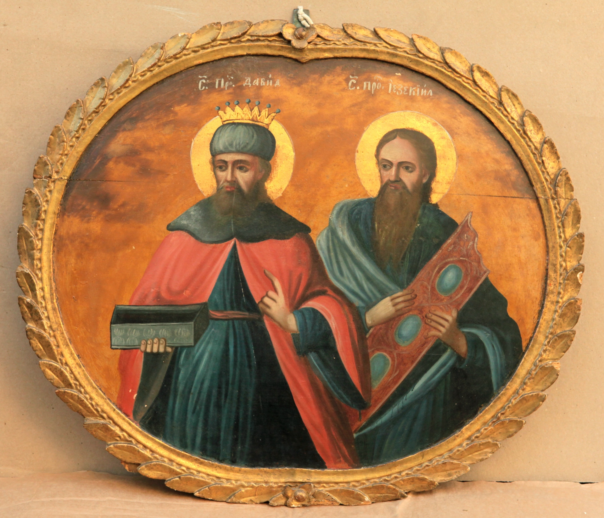 Icoană de formă ovaloidă: 2 proroci pînă la bust, în decor vegetal sculptat în lemn, aurit. David (stg) cu o carte în mîna drp, în chiton albastru şi mantie roşie. Iezechil în mantie albastru-deschisă, ţine în mîini un obiect al prorocirilor sale. Nimburi aurii. Fondal ocru-maro.