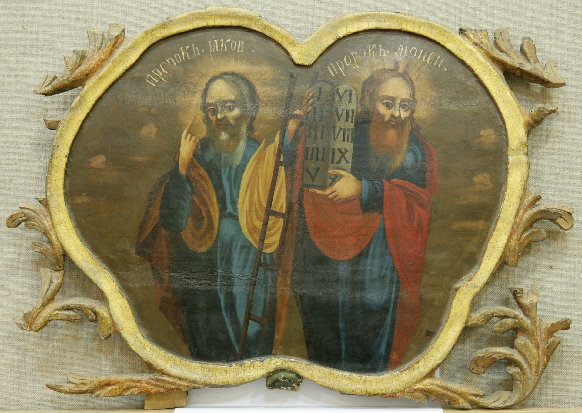 Icoană ovală cu profeţii Iacov şi Moise pînă la genunchi. Pr. Iacov - în veşmînt albastru şi ocru. Ţine într-o mînă o scară, cu cealalta indică către cer. Alături: Pr. Moise în tunică albastră şi mantie roşie. Ţine tabla cu Zece Porunci. La ramă - ornament vegetal sculptat.