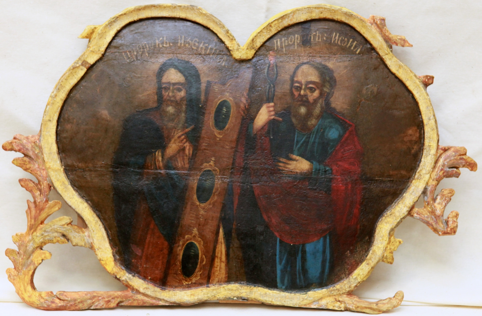 În nişă ovală neregulată cu decor sculptat - Prorocii Iezechil şi Ioel, pînă la brîu, poartă veşminte de epocă. Iezechil ţine într-o mînă un canat, pe care - 3 medalioane de culoare închisă (fiecare simbolizează una din propriile prorociri). Ioel ţine într-o mînă un cleşte cu cărbune roşu. Fondal neutru. Rama conţine decor vegetal.