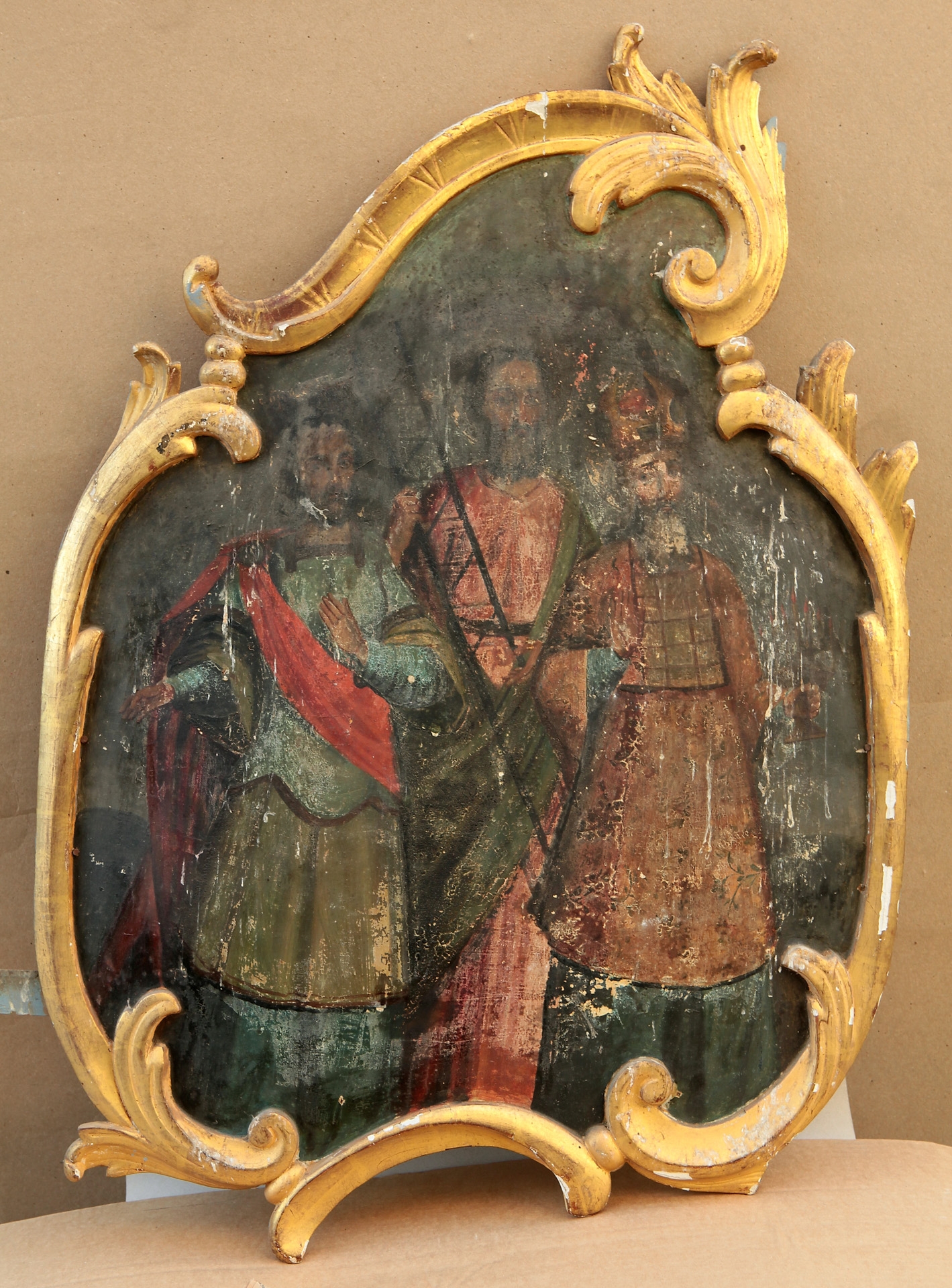 Într-un oval neregulat - 3 profeţi în statură pînă la genunchi ((centru) Isaia în chiton roz ţine o scară, (stg) Iosua Navi în chiton verzui şi mantie roşie, (drp) Aron în veşminte arhiereşti ţine în mînă o icoană. Imaginea e în cadru sculptat în lemn aurit (decor vegetal).