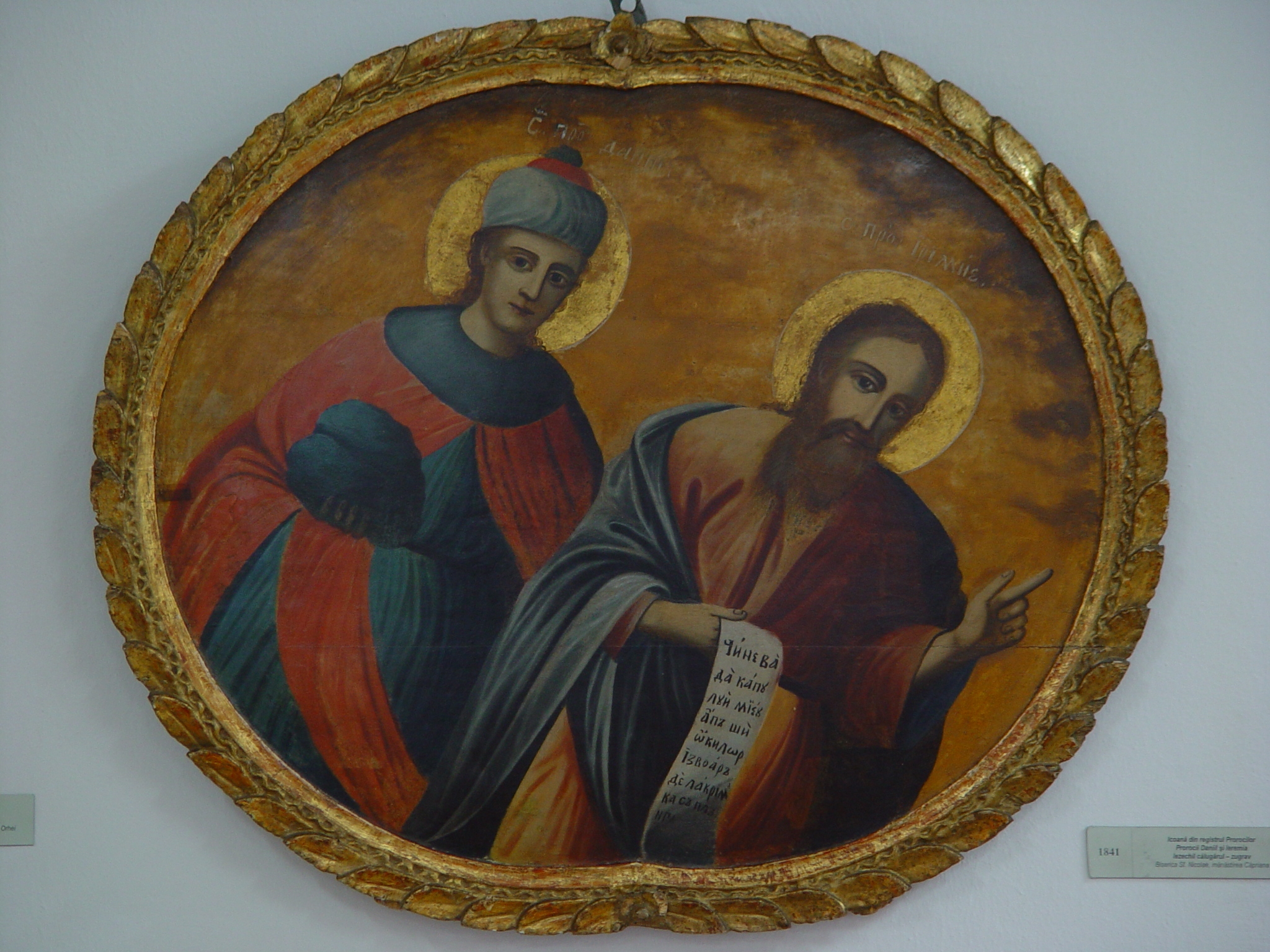 Icoană-medalion cu 2 personaje: Sf. Proroci Daniel şi Ieremia, pînă la brîu. Daniel poartă veşmînt albastru şi mantie roşie. Pe cap - acoperămînt gri-roşu, ţine în mînă drp o piatră (?) albastră. Alături e Pr. Ieremia - în chiton ocru cu mantie albastră, ţine în mînă un sul deschis. Nimburi aurii. Fondal ocru. Ramă cu ornament vegetal sculptat în lemn.