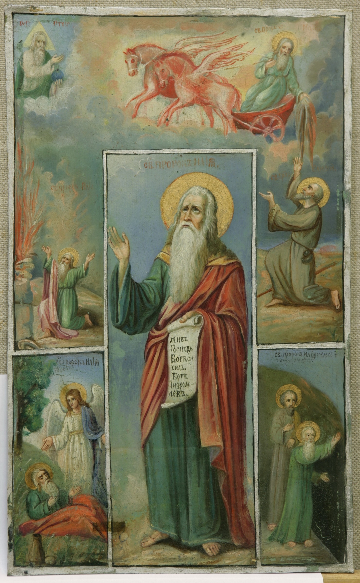 Proorocul Ilie (centru) în plină statură pe fondal de cer senin. Priveşte sus, spre cer. Ţine un sul deschis. Poartă veşmînt verde cu mantie roşie. Nimb auriu. Partea de jos şi sus - scenă din viaţa Sf. Ilie. Gama: roşu, verde, azuriu, ocru, alb.