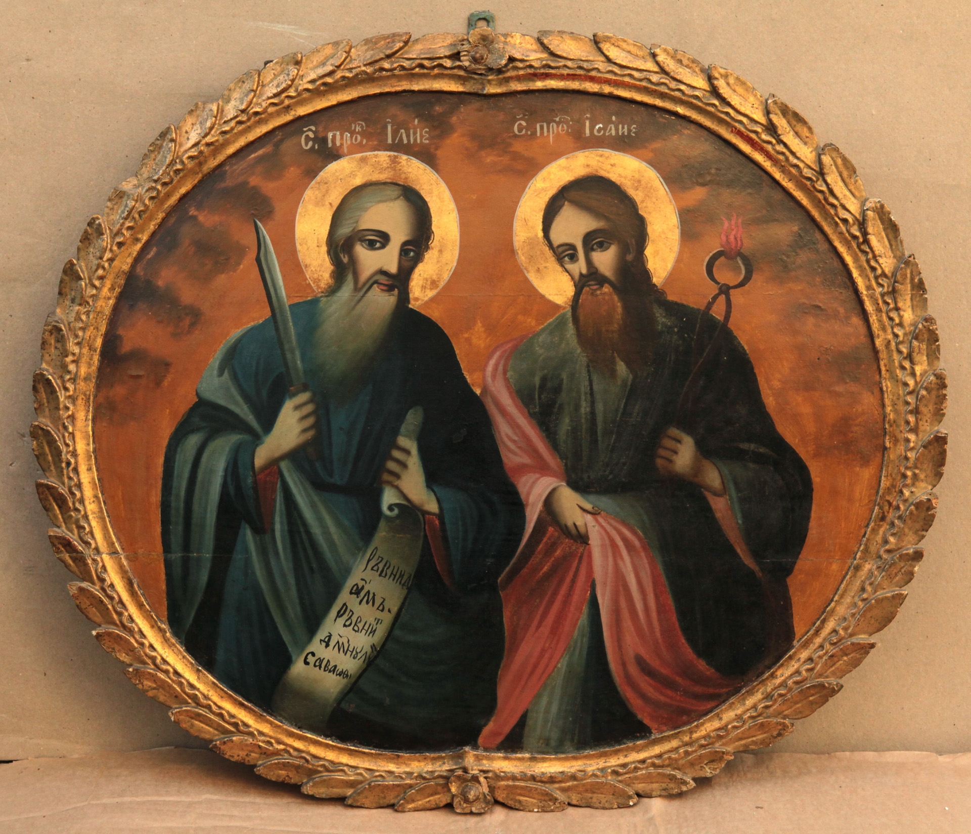 Icoană de formă ovaloidă: 2 proroci pînă la genunchi, în decor vegetal sculptat în lemn, aurit. Ilie are barbă şi păr gri. Poartă veşmînt albăstrui. Ţine într-o mînă un cuţit, în alta - un sul cu inscripţii. Isaia are barbă şi păr brun, poartă tunică albastră-verzuie şi mantie roşie. Ţine în mînă un cleşte cu cărbune roşu.