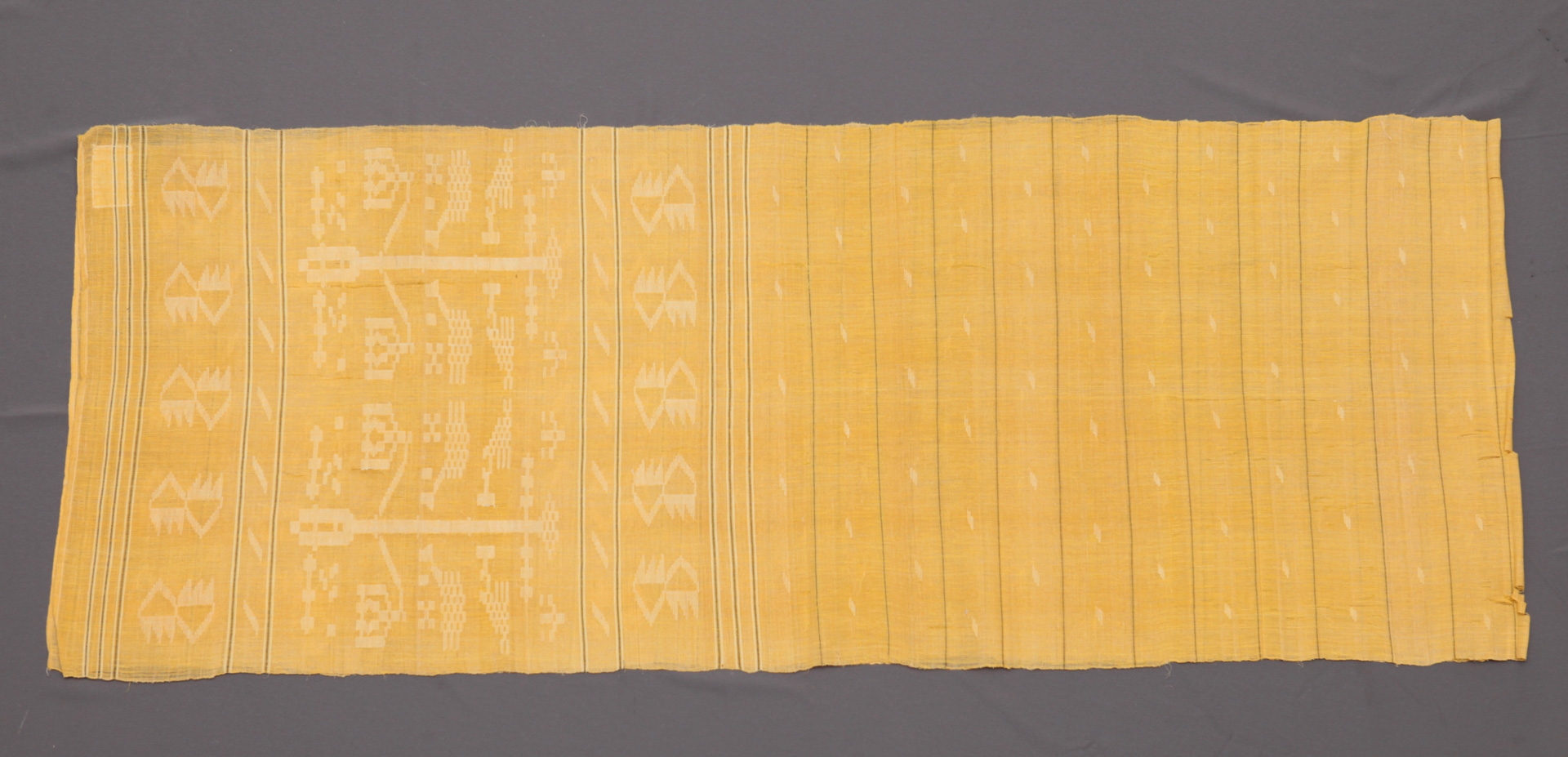Fîşie lungă de pînză, cîmp vîrstat, motive geometrice. La capete - organizat în 3 regstre, registrele laterale sunt cu decor geometrizat, registrul central are motivul "Pomul vieţii"; despărţite de benzi decorative. Cromatica: portocaliu, alb, negru. Margini tivite.