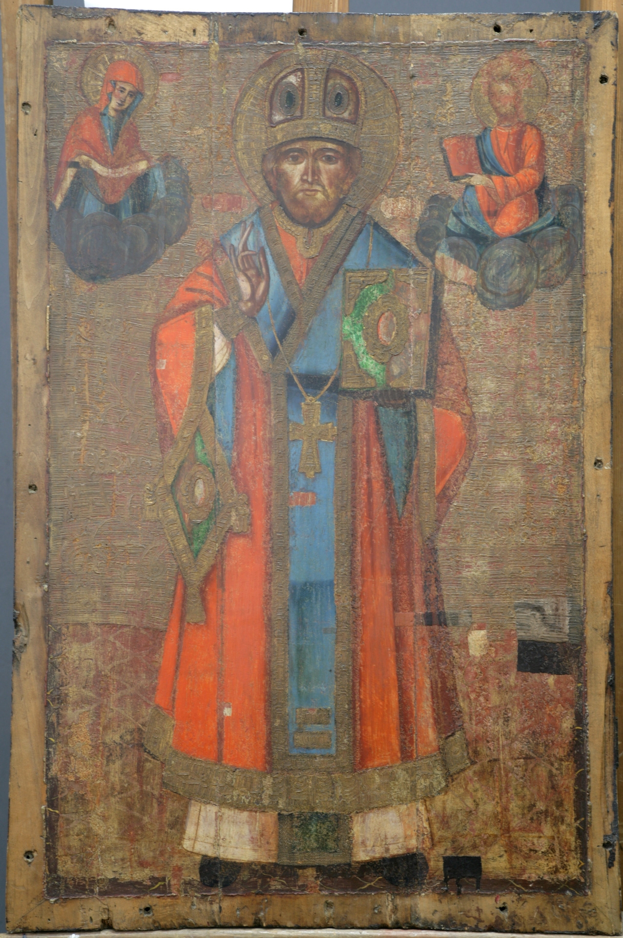 în plină statură. Poartă veşmînt arhieresc. Cu mîna drp binecuvîntează, în cea stg ţine evanghelia. Sus stg: Maica Domnului pe nori ţine omoforul, sus drp: Iisus ţine evanghelia. Gama: ocru, roşu, albastru, gri.